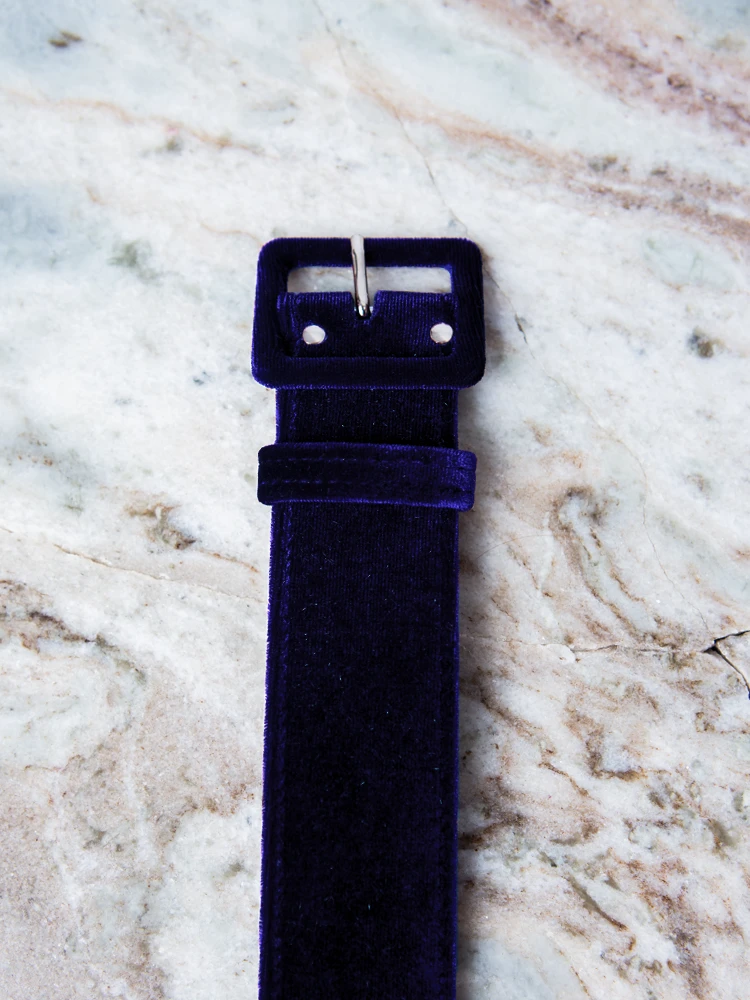 Completely handmade in Los Angeles, our velvet faux leather belt is 1.5 inches in width and features a removable slider and grommet closures.