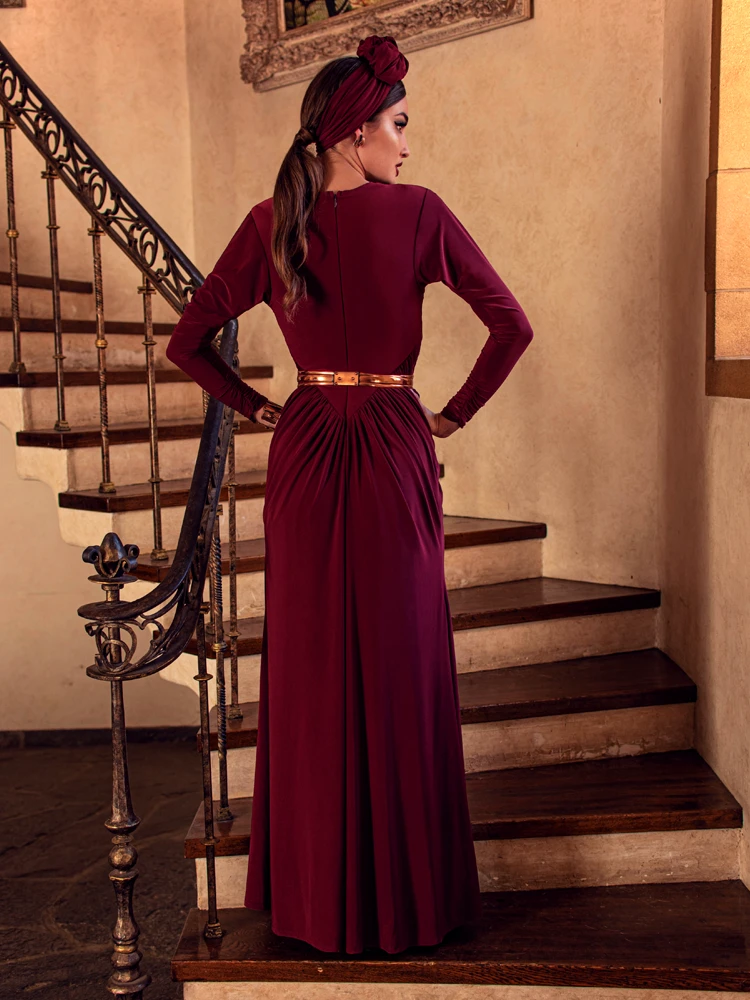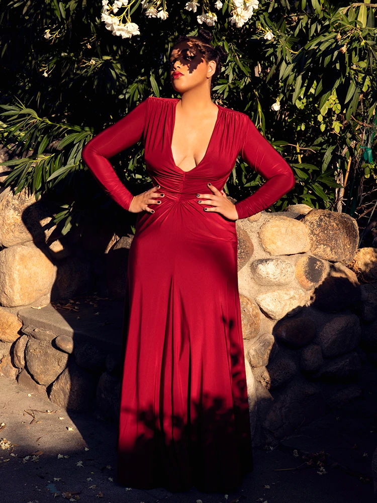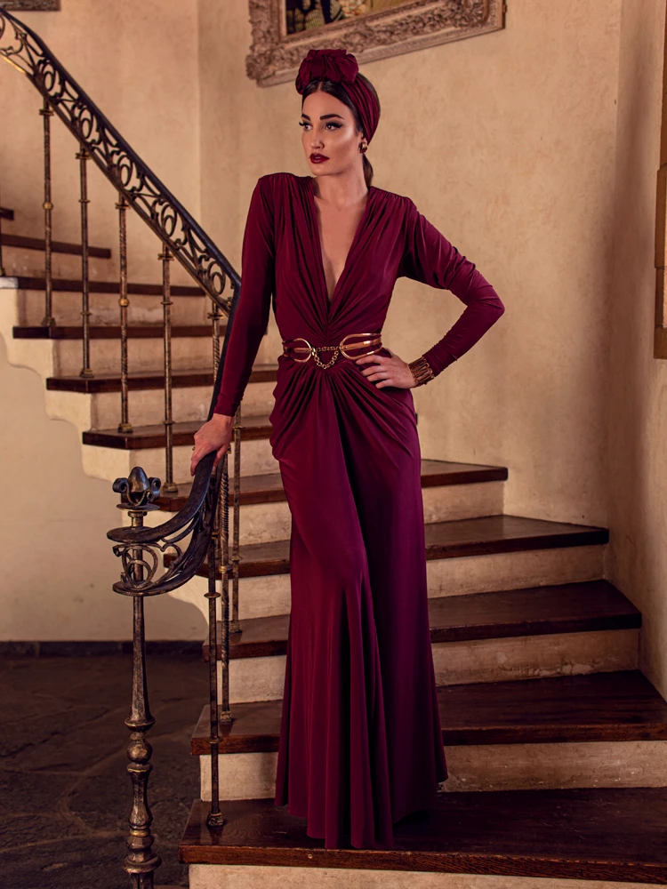 Inspired by 1920s old Hollywood gowns with a little 1980s flair, we reimagined this style in a stretchy yet wearable soft buttery fabric. This elegant and extremely decadent piece is not for the faint of heart, with its sexy plunge neckline and structured shoulder pads. Sleeves have a soft elastic gathered detail at the wrists, with the waist sheered to the heavens. This dress is a true statement piece. The bodice is lined in a firm ponte for support and shaping and the waist to hem is fully lined to hide undergarments.Â