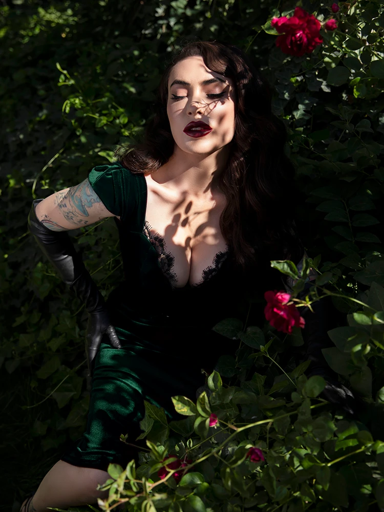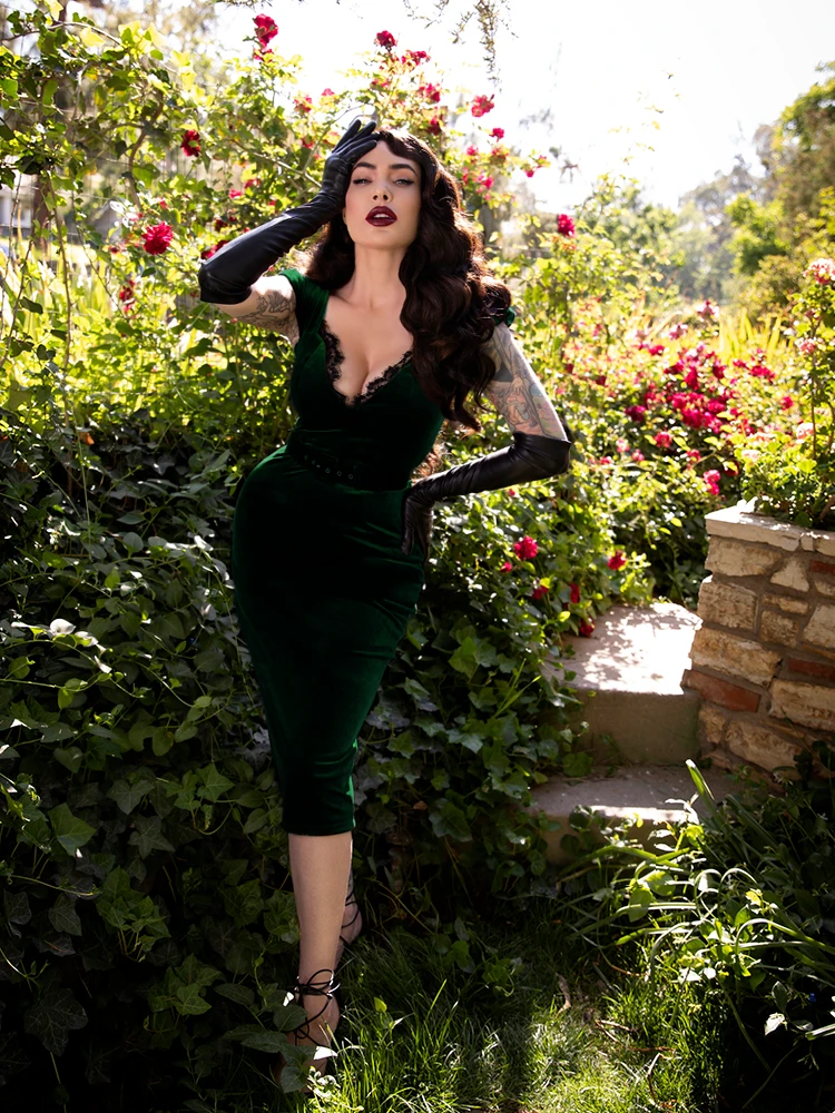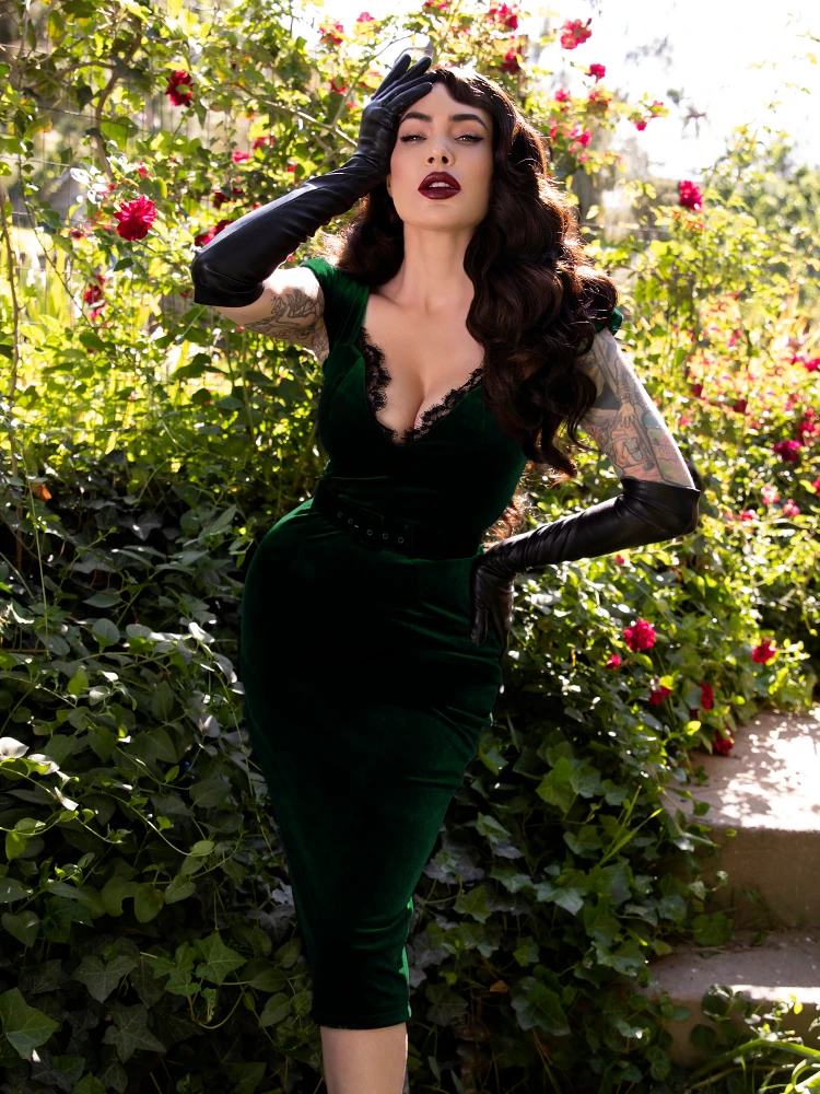 Inspired by the Victorian gothic fashion of Penny Dreadful and 1950s film vamps, this wiggle dress is just as dangerous as those leading ladies. The fluttered cap sleeves balance the deep plunging neckline and tight pencil body. Made from high-end stretch velvet with imported eyelash lace, the entire body is fully lined in Ponte. This dress also features a matching 1.5-inch faux leather velvet-covered belt, back zippered closure, and a clean back slit!