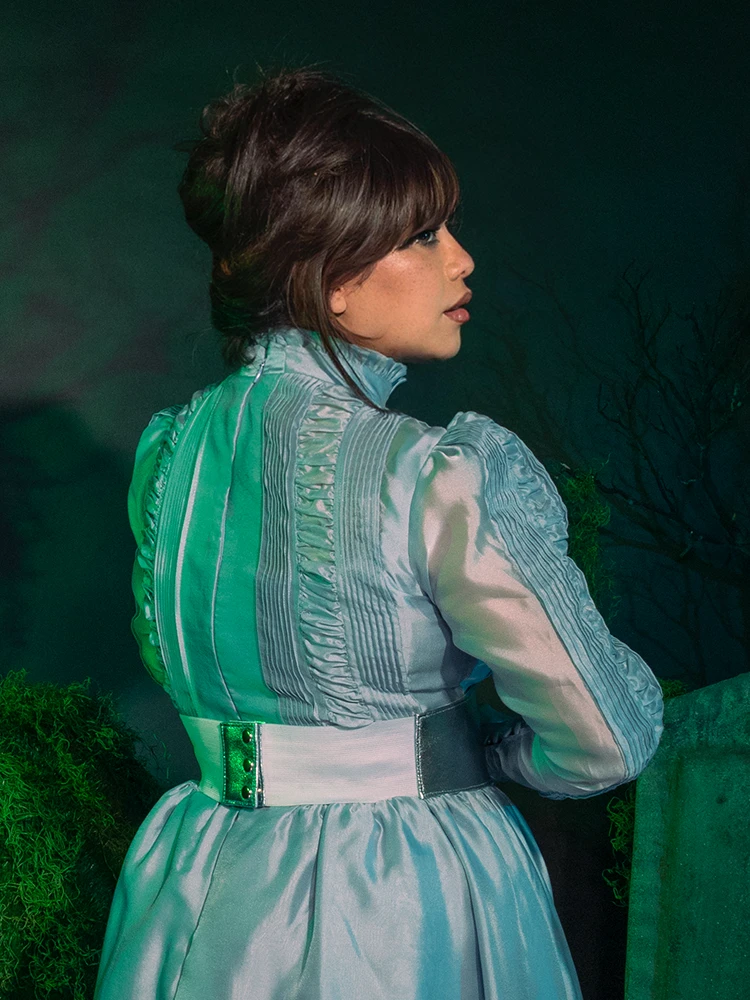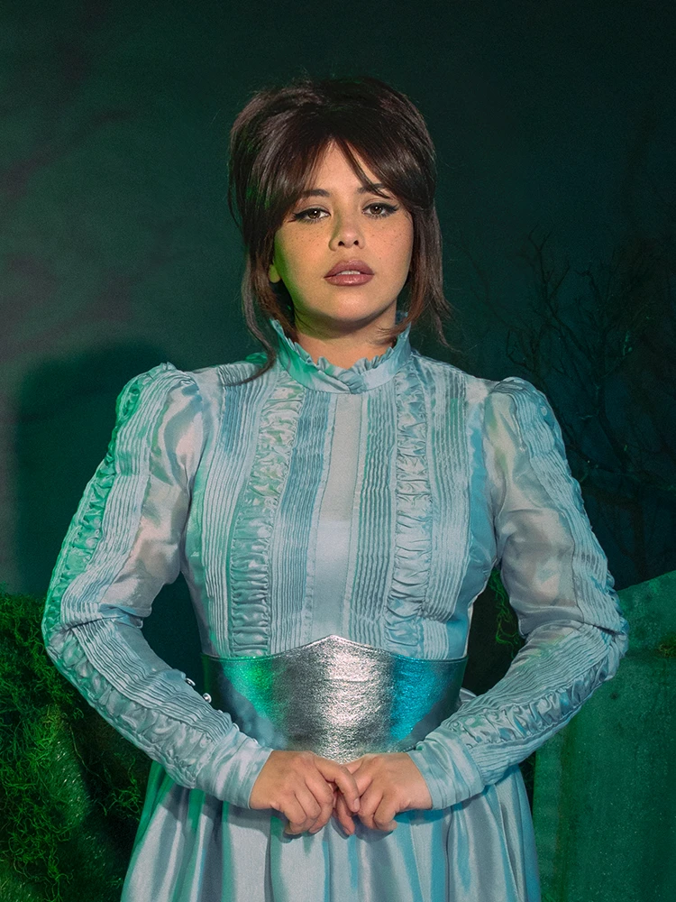 Step into the afterlife with style in the Astrid Afterlife Corset Belt, inspired by the new film Beetlejuice Beetlejuice™. This belt is the perfect companion to the Astrid Afterlife Dress. Made of metallic crinkle vegan leather in a shimmery silver blue, just like the one worn by Astrid in the film. The back of the belt has plush elastic and snap closure. It’ll be sure to complete the afterlife look!