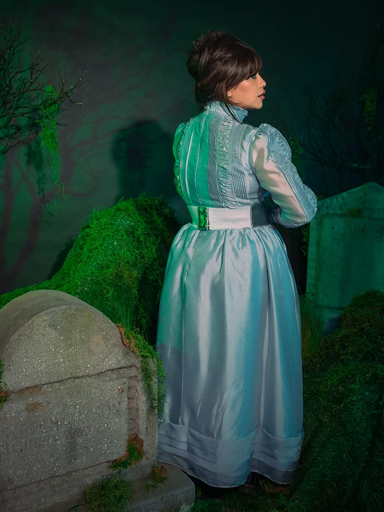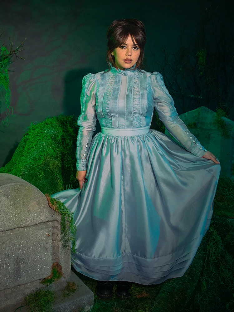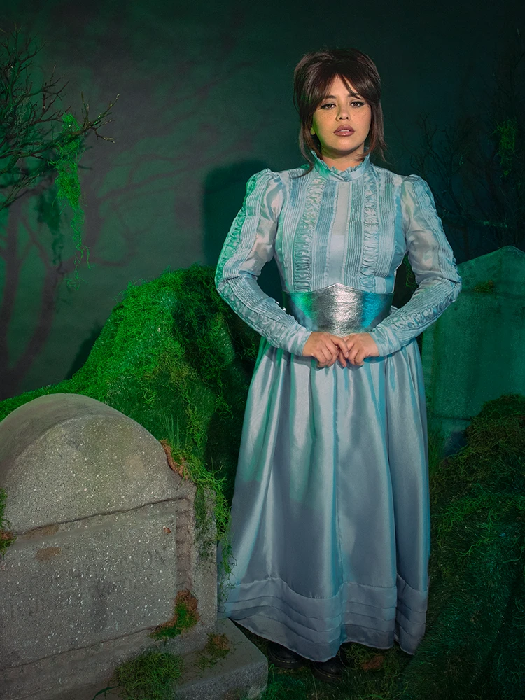 The dress features tuck pleats and shirred panels along the bodice and long sleeves. It also features a high ruffled collar for that classic Victorian touch. The pebble satin lining ensures comfort, while the gathered skirt at the waist gives it a flattering silhouette. The invisible bridal zipper and the elastic waist at the center back provide ultimate flexibility. Pair this with our Beetlejuice Beetlejuice™ Astrid Corset Belt for a look straight out of the film. Whether you’re venturing into the land of the undead or just making a statement, this dress is your go-to!