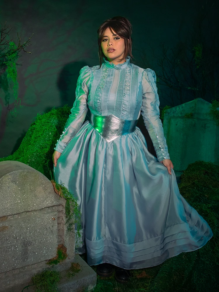 Step into the afterlife with style in the Astrid Afterlife Dress, inspired by the new film Beetlejuice Beetlejuice™. This midi dress is a perfect blend of spooky elegance and avant-garde fashion, just like Astrid herself. With its iridescent blue silver and gray chiffon and organza, you’ll shimmer and shine like a ghostly vision.