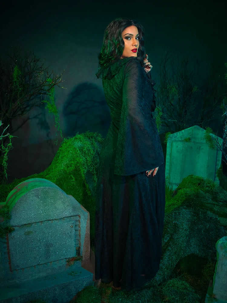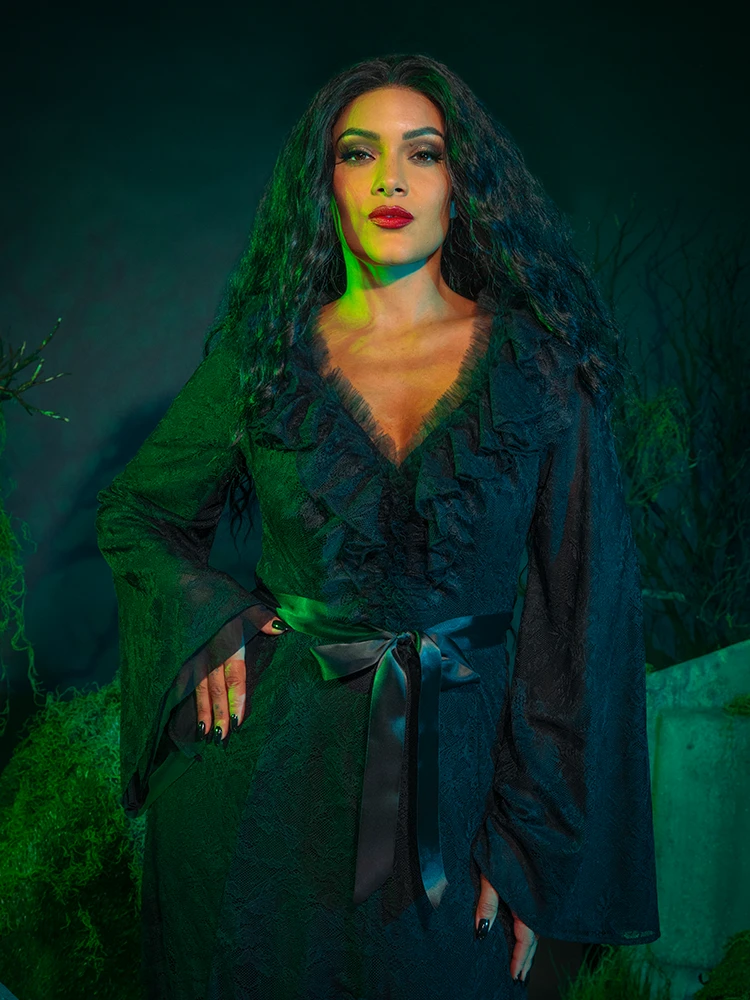 Whether you’re channeling your inner sorceress or preparing for a night of dabbling in the dark arts, the Delores Dress in black lace is a vibe. Inspired by Delores, the mysterious ex from the new Beetlejuice Beetlejuice™ movie, this dress captures her dark feminine power and timeless allure. The sexy black raschel knit lace maxi dress features a plunging portrait neckline with hook and eye-opening at the center front, beautifully complimented by a ruffled lace trim and tulle collar that adds a touch of drama. The double-faced satin ribbon is sewn to the waist for a wraparound look. The long bell sleeves create a captivating silhouette, the front has a long center slit so you can show off your legs in the afterlife, while the stunning lace shell over a soft knit brandy lining ensures a comfortable yet striking fit.