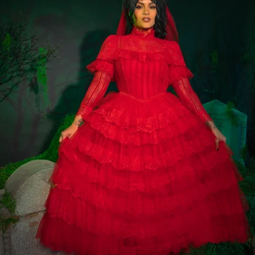 “It’s Showtime!” Rediscover the morose allure of Lydia Deetz as she faces the afterlife once more in this stunning red wedding dress, inspired by the new film Beetlejuice Beetlejuice™. Now a grown woman, Lydia must save her daughter, Astrid, making a daring bargain with Beetlejuice himself. This dress is a bold, couture homage to Lydia’s unforgettable wedding dress from the first film. With its rich red raschel floral lace and tulle tiers, you’ll be ready for your very own ghostly union. The Victorian style shines through with a high lace trim and soft ruffled tulle collar, shirred lace cap sleeves, and delicate lace stripes that mirror the intricate detailing on the bodice, giving you an air of timeless elegance. The gathered waist, tulle, and lace-trimmed tiered skirt cascade to the floor creating a dramatic silhouette that’s as enchanting as it is haunting. Every authentic design detail was attentively recreated to make the ultimate collector’s piece for your closet.