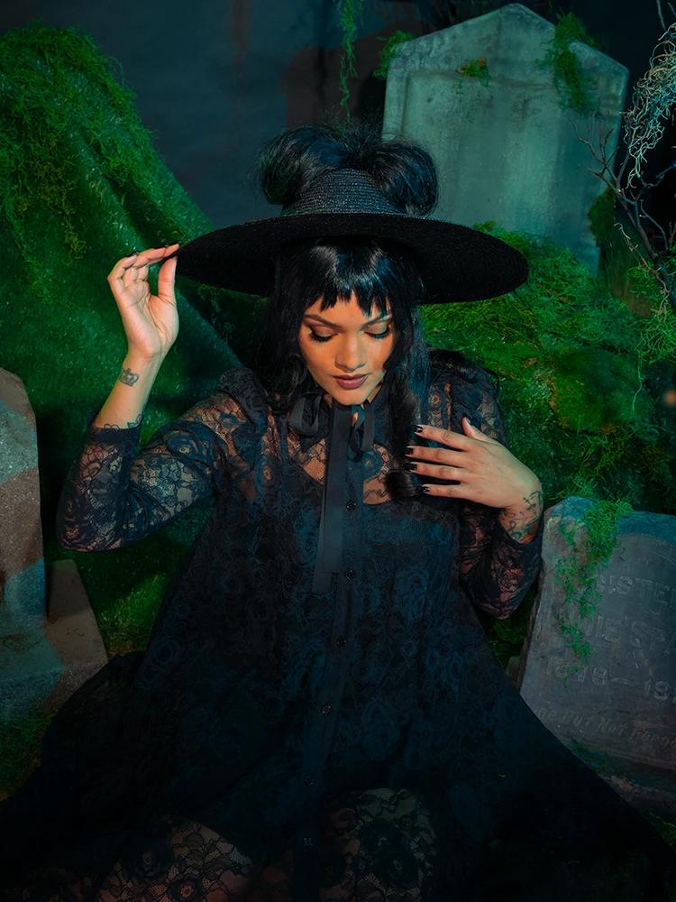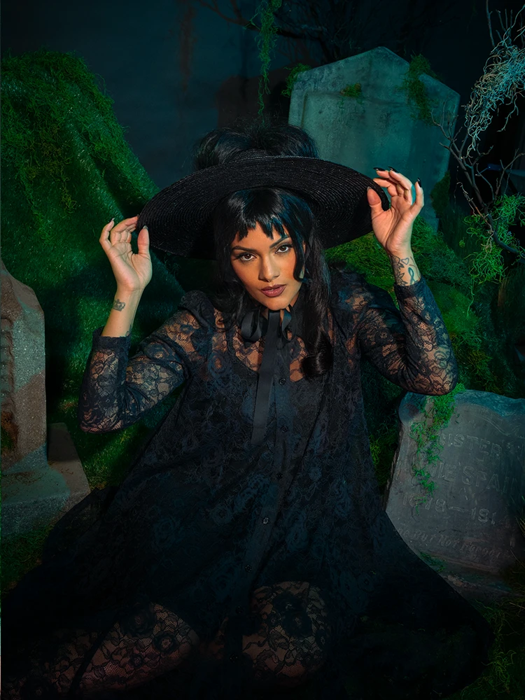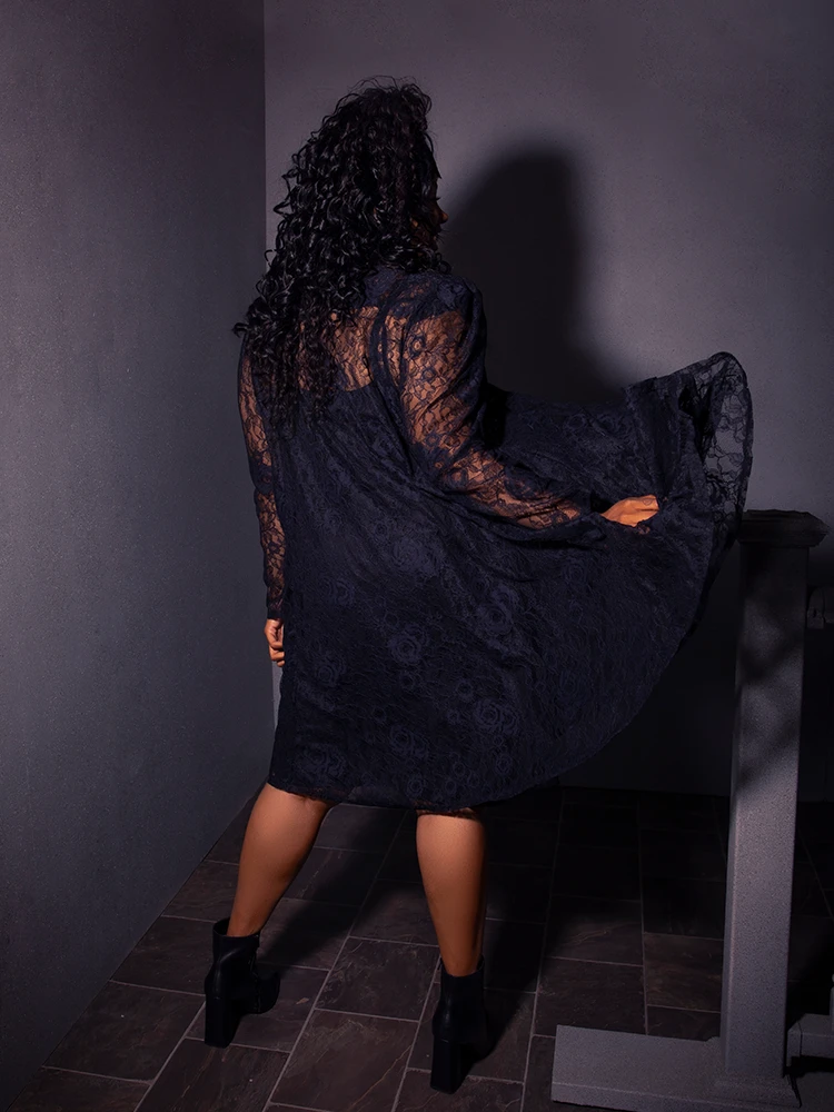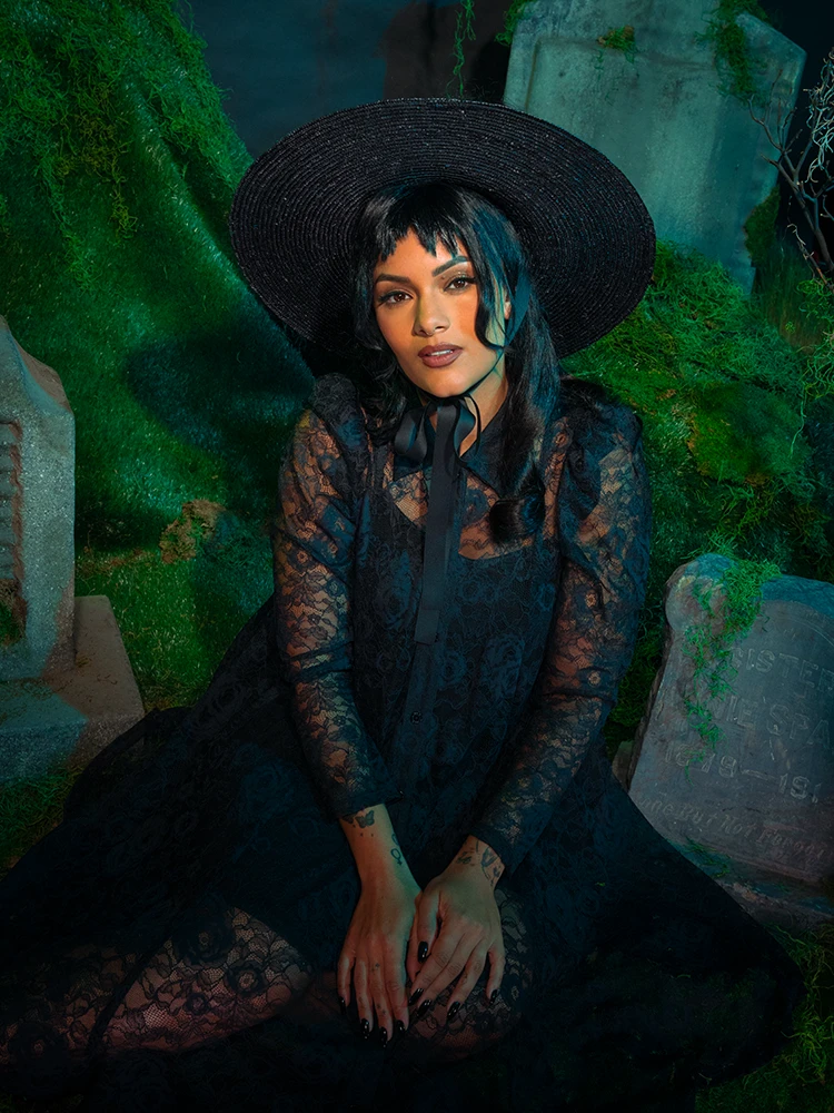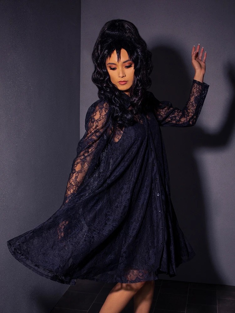 “My whole life is a dark room. One big, dark room.” The Darkroom dress features a front button-down closure with a neck collar, a slightly puffed long sleeve, and a free-flowing lace trapeze bodice. Comes with separate ITY knit slip.