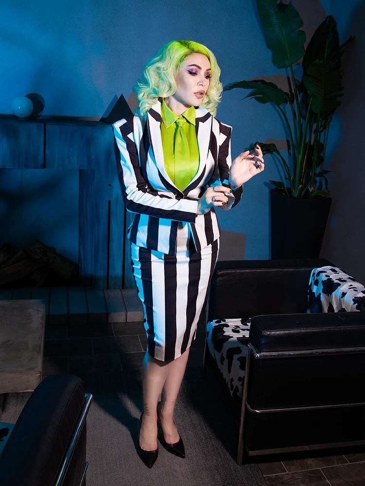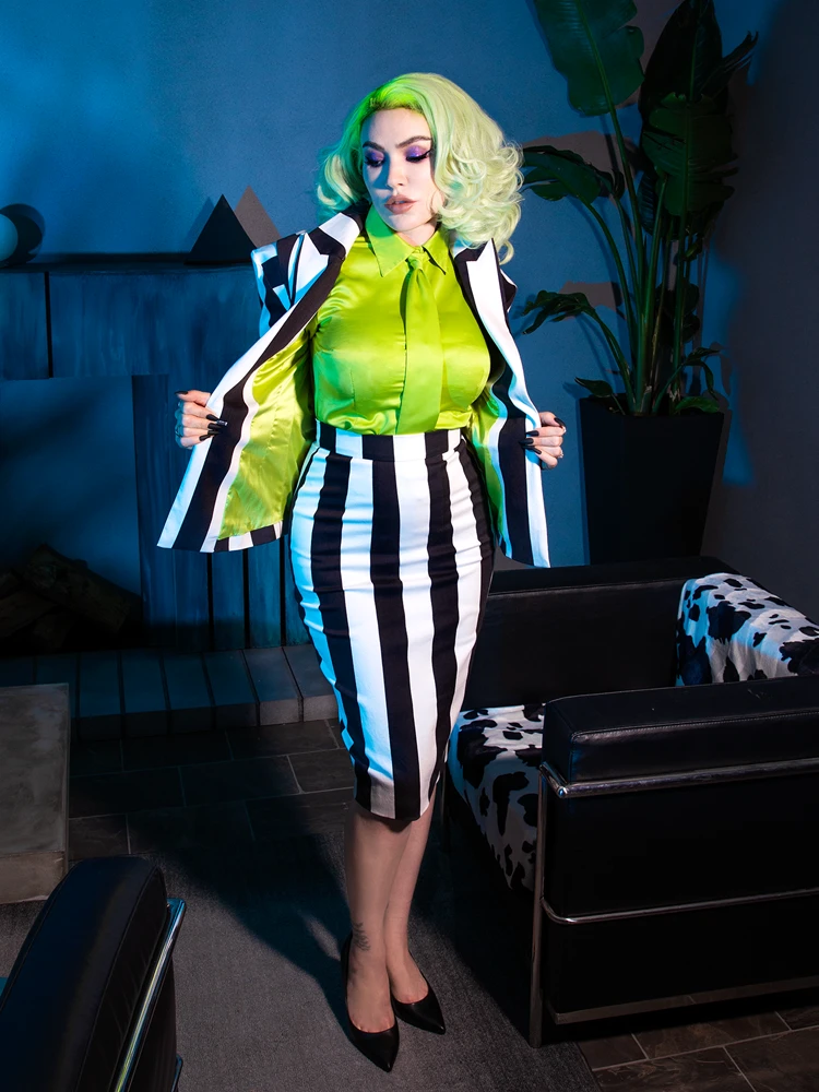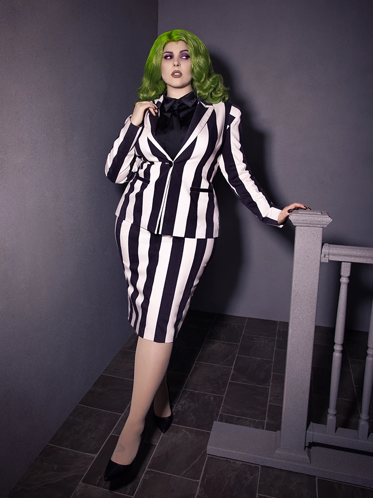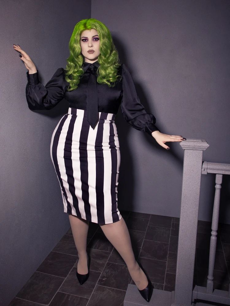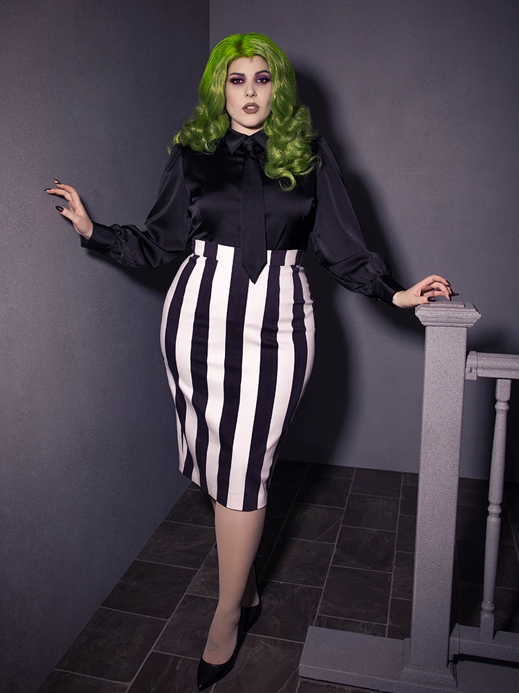 The BEETLEJUICE™ Striped Pencil Skirt is made to beautifully accentuate your hourglass figure! This skirt effortlessly pairs with the Bowie Blouse with Matching Tie by La Femme En Noir. You can complete your ensemble by coordinating our BEETLEJUICE™ Striped Corset Blazer, Just like the ghost with the most!