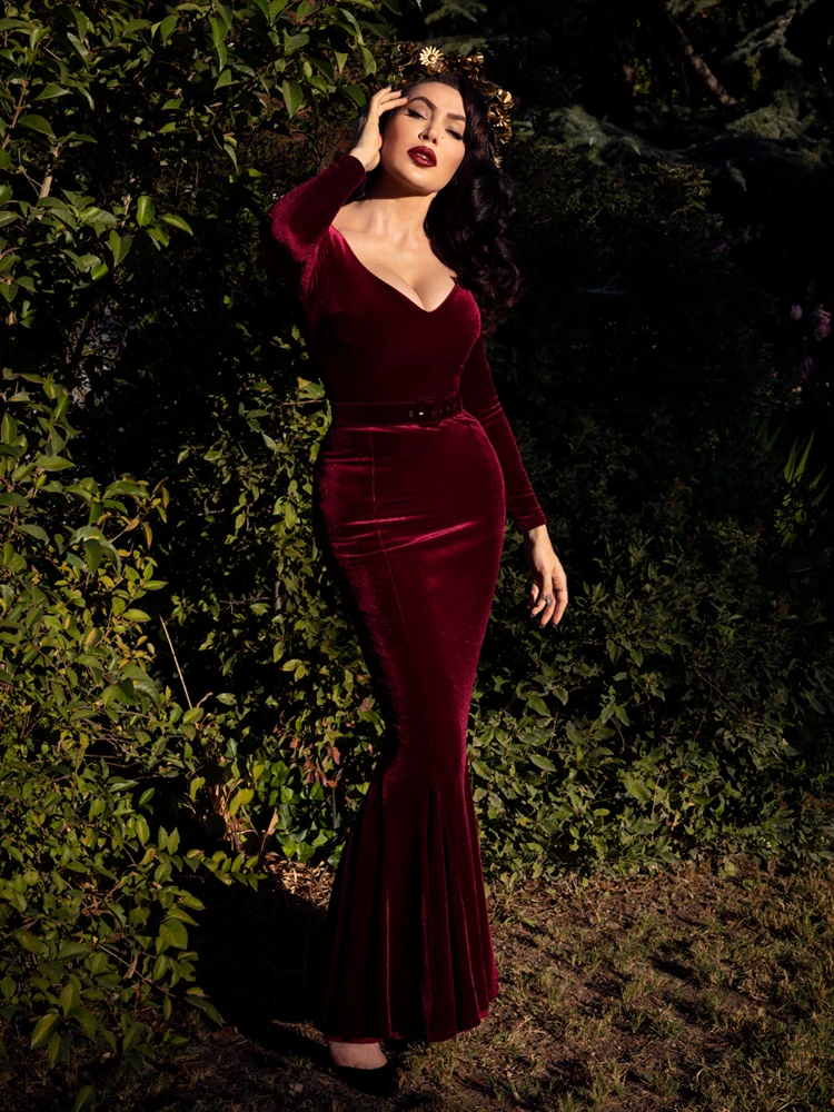 Inspired by the most iconic gothic ladies in film, this plunging velvet gown has the most full and figure flattering mermaid hem. This gothic glamour gown is fully lined and features a matching 1.5 inch faux leather velvet covered belt. This style has a lower and wider cut neck than our classic Black Marilyn dress, for an extremely decadent look.