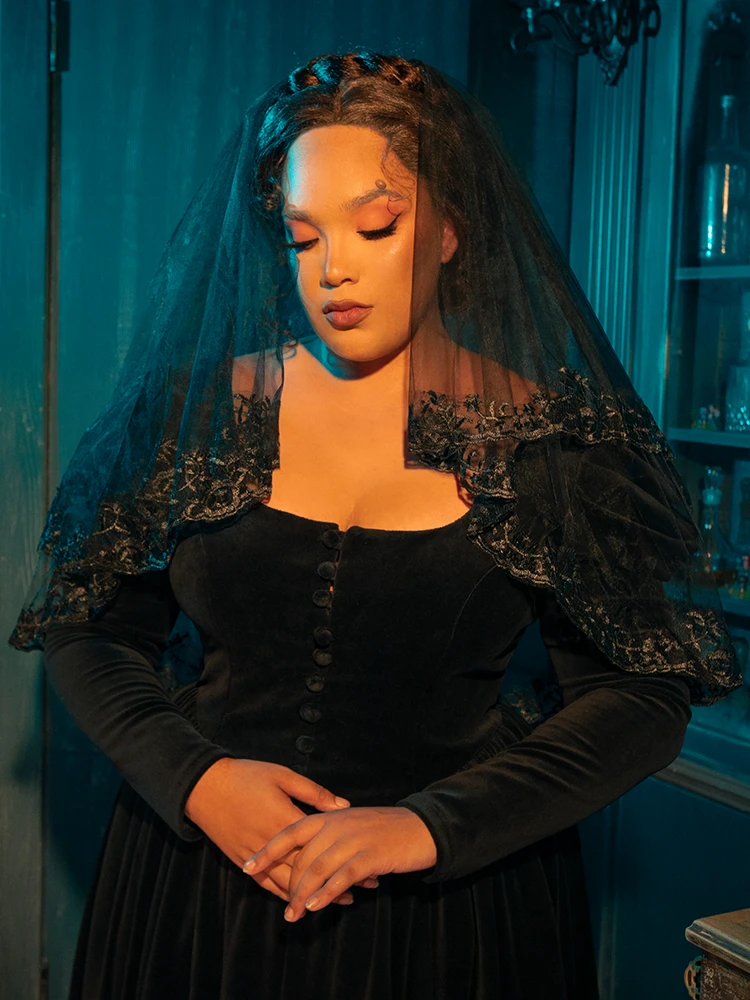 The double tulle long veil is polished off with a scalloped floral embroidery lace trim and is secured on the head with a hair comb.
