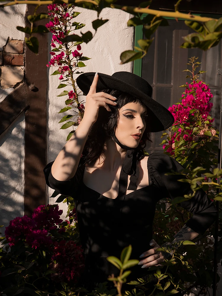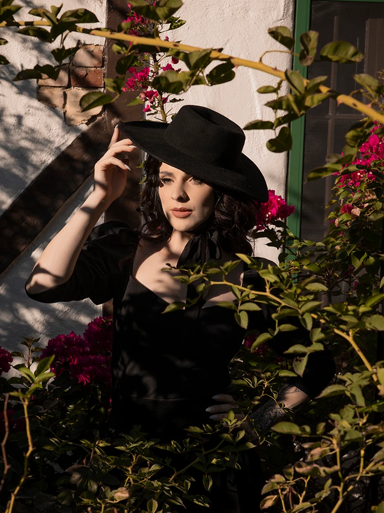 Beautifully shaped felt bolero aligns perfectly with our Southern Gothic Black ensemble. The bolero includes a wide matching black grosgrain ribbon.