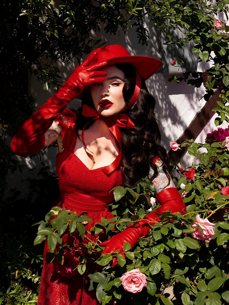 The beautifully shaped felt bolero aligns perfectly with our Southern Gothic crimson red ensemble. The bolero includes a wide matching crimson red grosgrain ribbon.