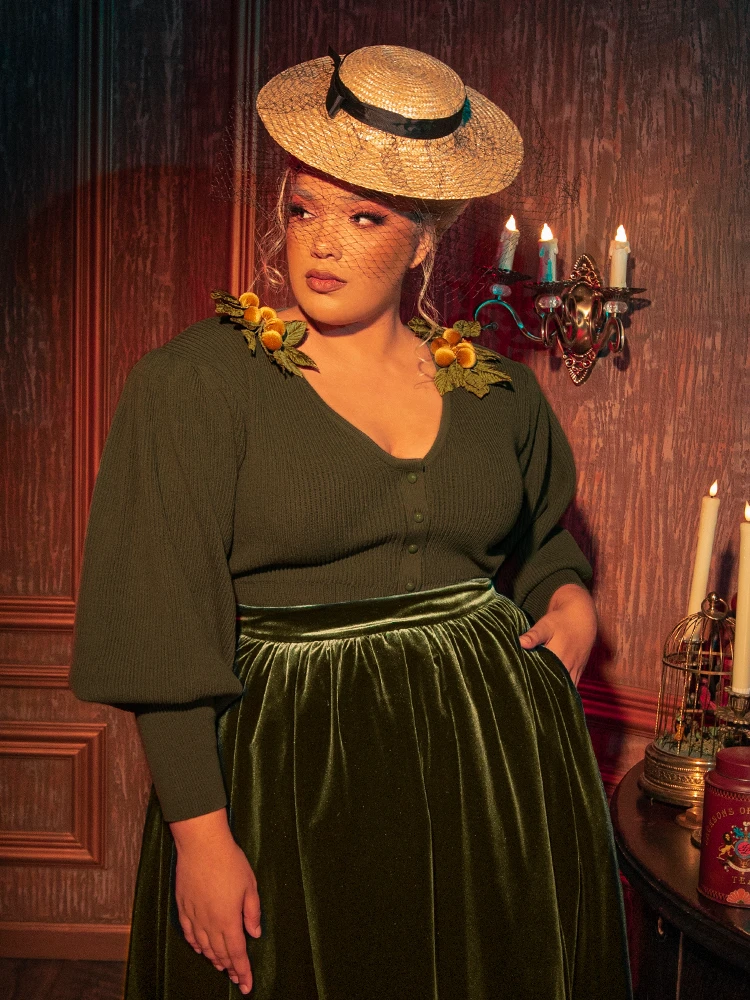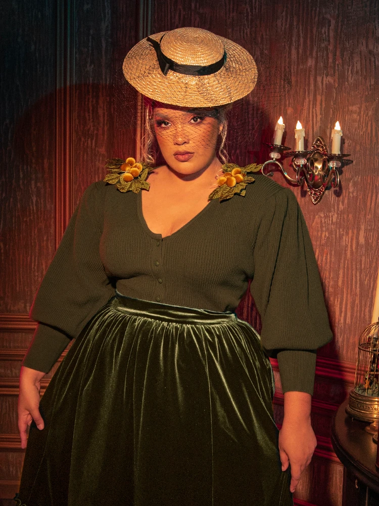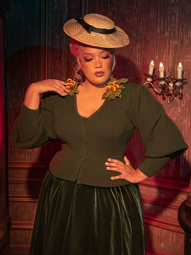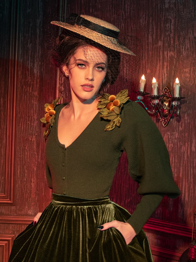 Edith’s lavish wardrobe, featuring vibrant olive greens, marigold, and whites, contrasted against the dark, foreboding setting surrounding her. Inspired by her iconic Victorian olive green outfit, we have reimagined it as a luxurious, full-fashioned 7 gauge soft knit with a classic half cardigan stitch at bodice and sleeves and 1 x 1 rib at waist and sleeves. It is adorned with two hand-crafted velvet green embossed leaf brooches and velvet marigold pompons. The brooches, reminiscent of the trim that graced Edith’s neckline, sit high on the neck and shoulder. This opulent piece boasts a soft V-neck, delicate faceted buttons on the front knit placket, and a fitted ribbed body with a flared leg of mutton sleeve. For more drama we’ve added shoulder pads that are removable. The ribbed hem accentuates the waist for a figure-flattering, hourglass silhouette, finished with a delicate scalloped edge.