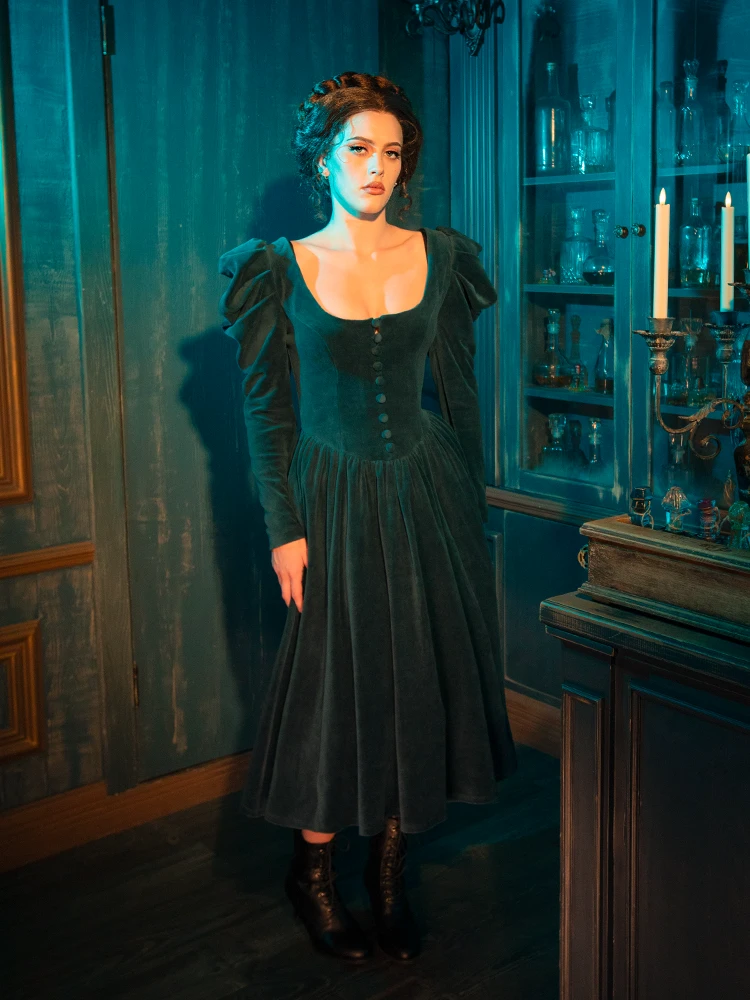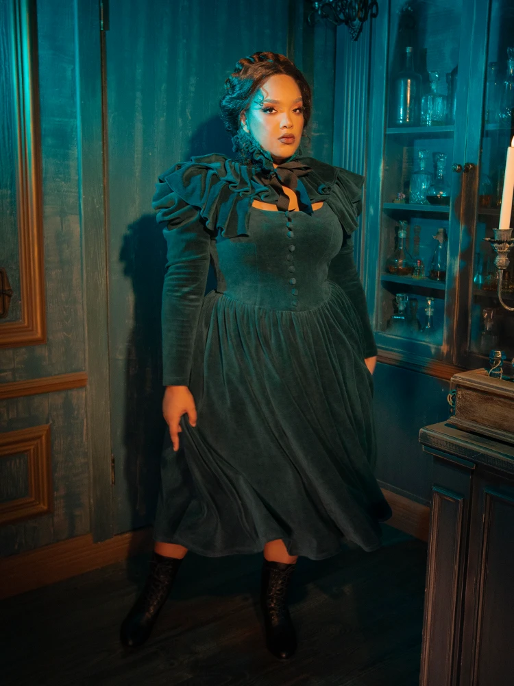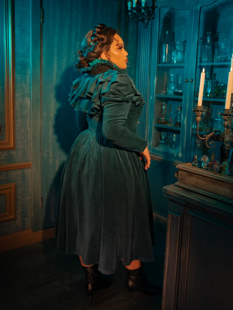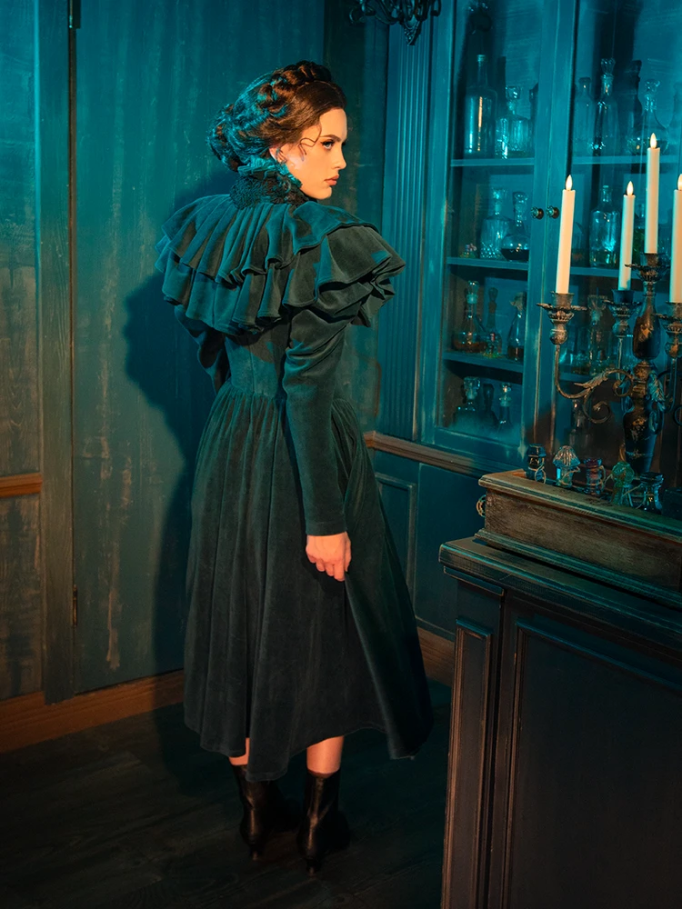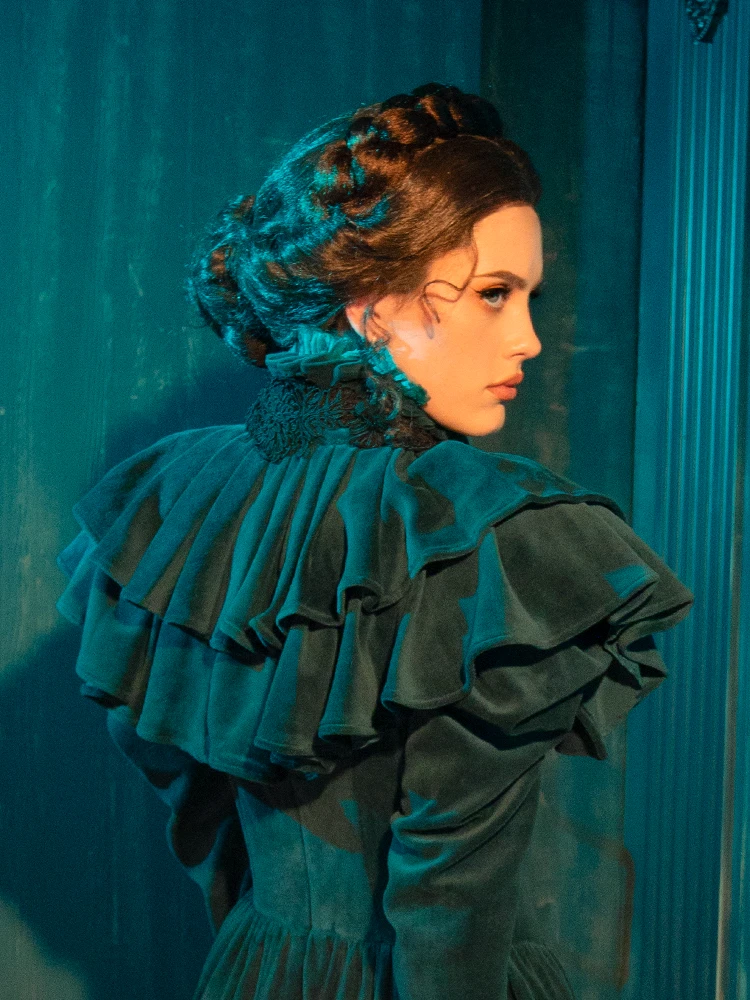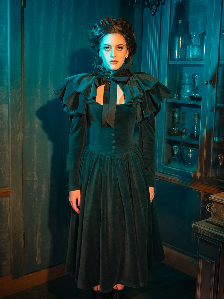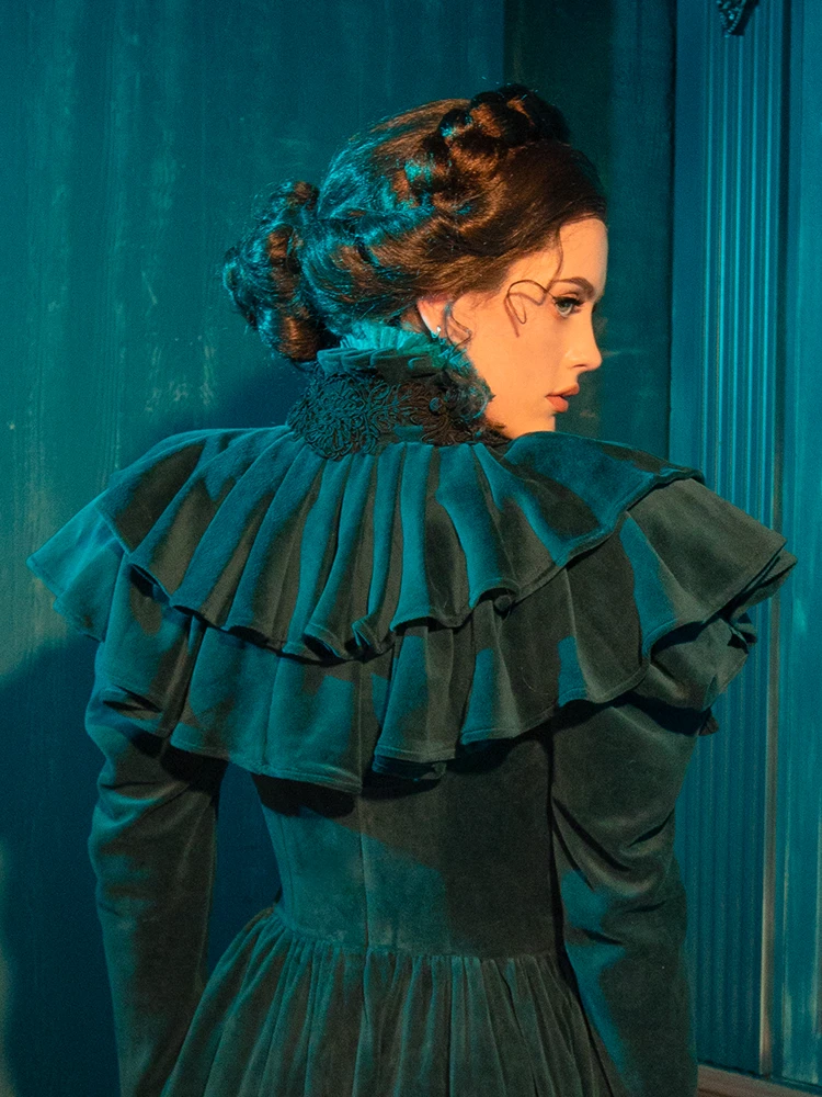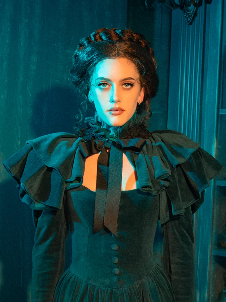 Immerse yourself in the opulence of Lady Lucille Sharpe’s teal velvet ensemble, featuring a decorative capelet that perfectly complements the silhouette of the dress. The velour fabric is both dramatic and comfortable, while the ruffled capelet adds an elegant touch. With a deep portrait neckline and front self-covered buttons (with the upper three functional), this dress exudes sophistication. The bodice’s princess seams create a Victorian hourglass figure without sacrificing comfort and gives a touch of support with light boning at the sides. The dress boasts deep pockets and a full shirred waist and swing shape, and the center back concealed bridal zipper closure provides a flawless finish. And let’s not forget the statement focus – the leg o’ mutton deep pleated sleeves.
