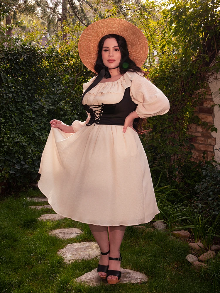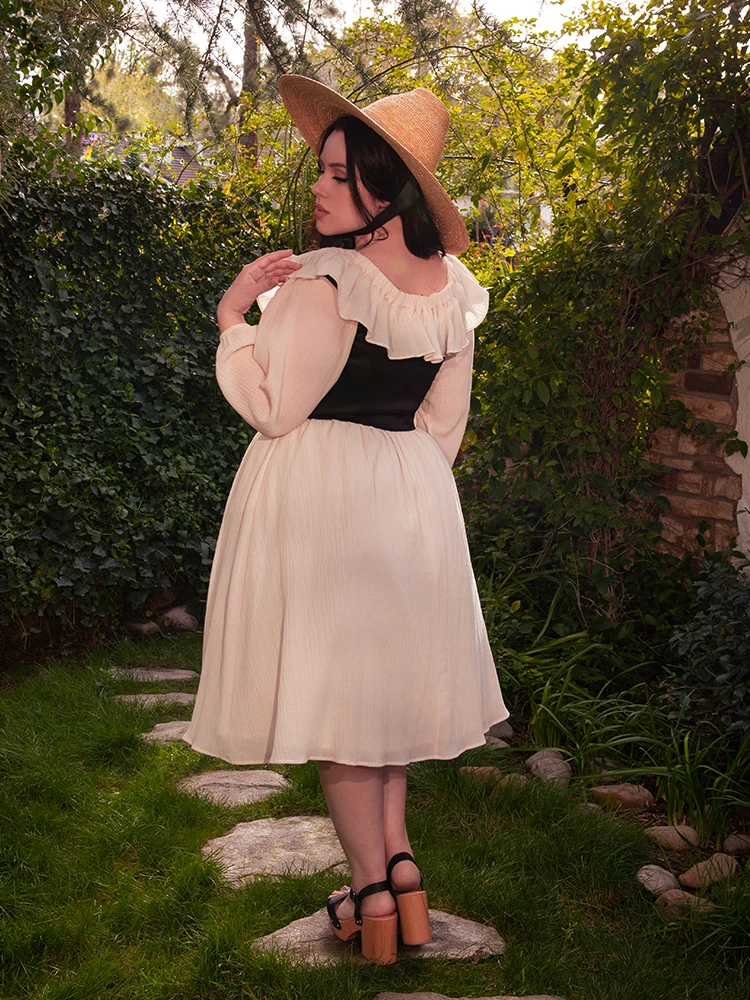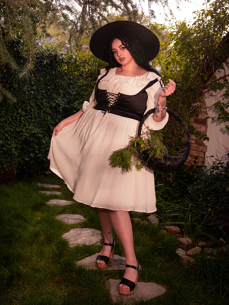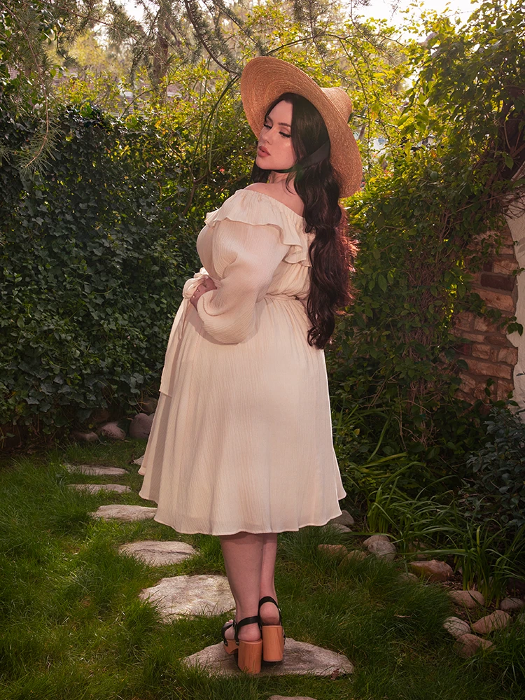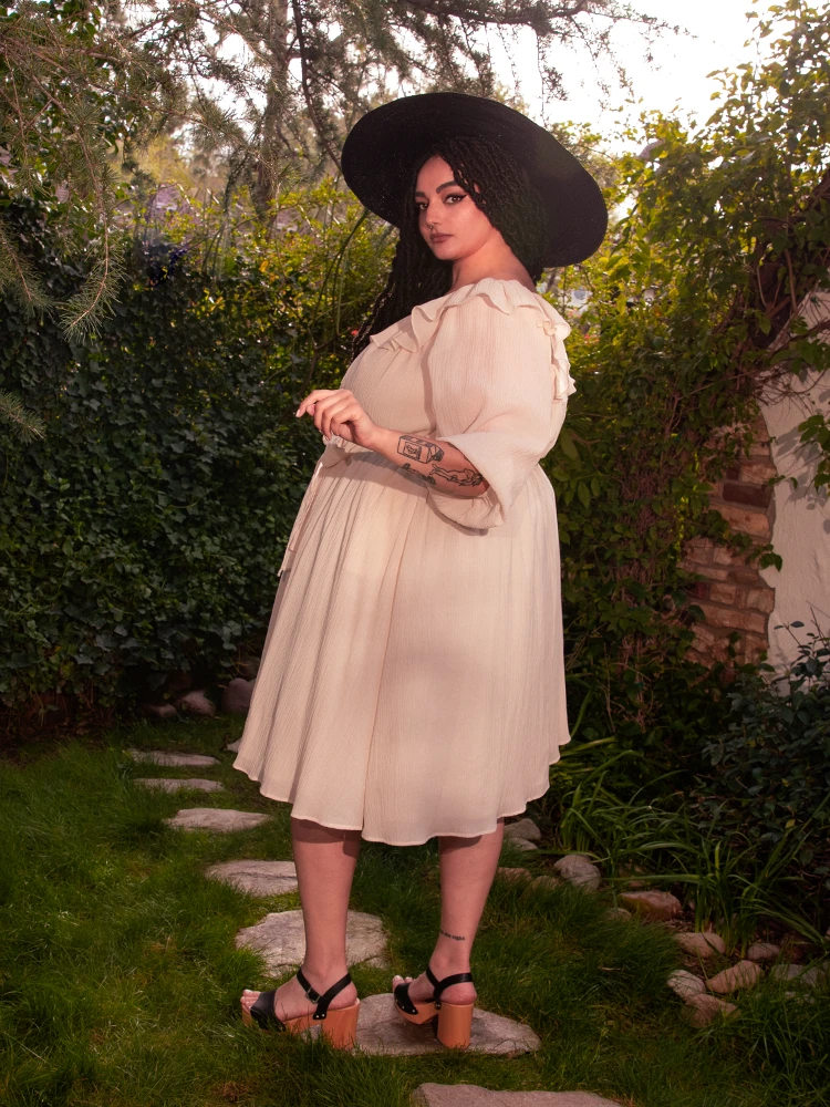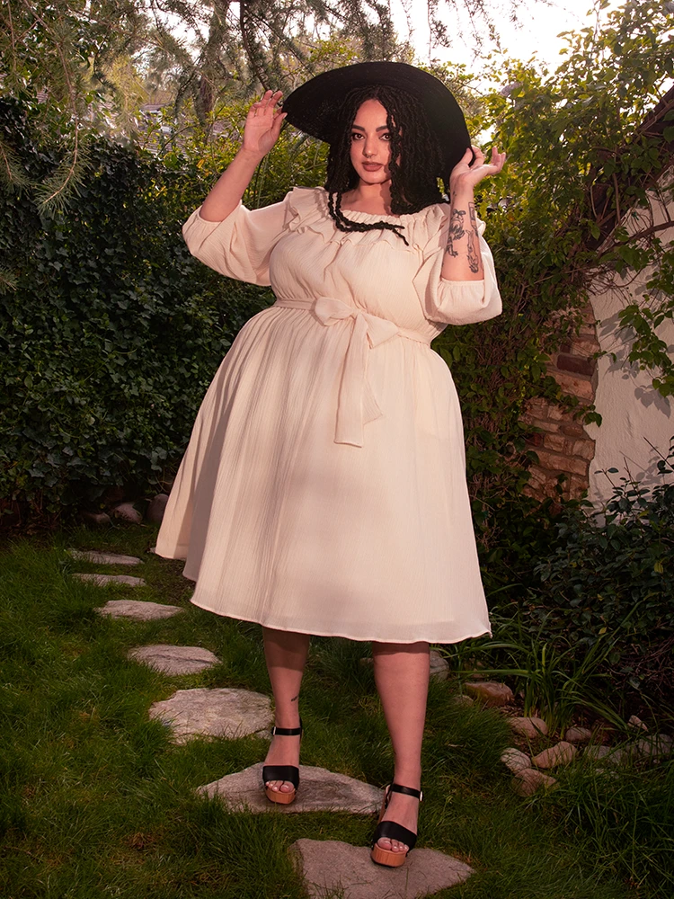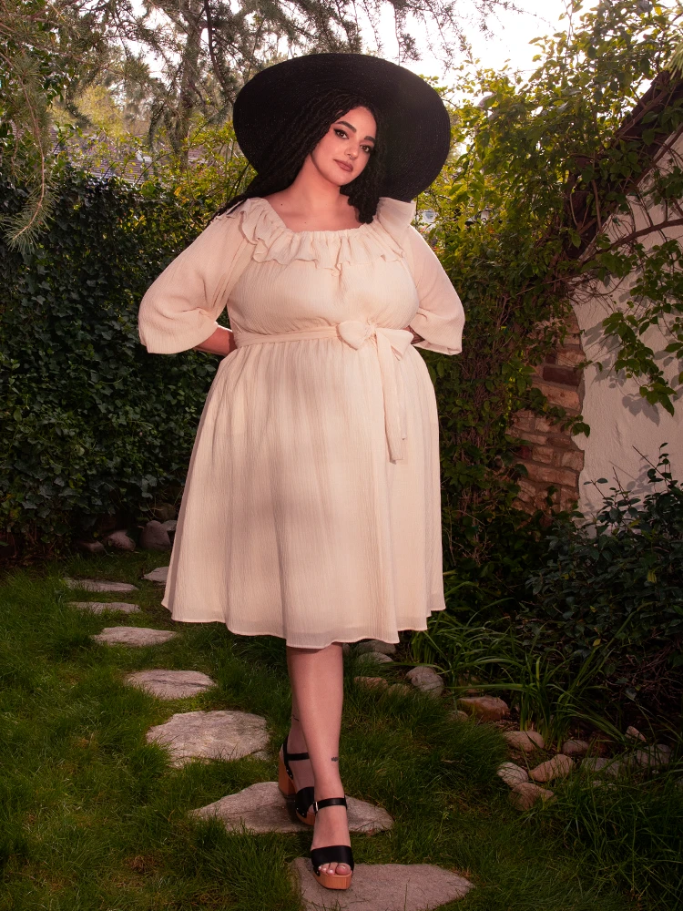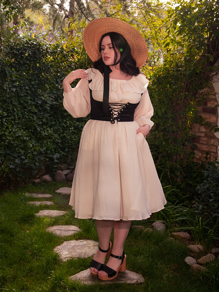 Embrace the mysterious mistress of the forest vibes with our Divination Peasant Dress.Ā This effortless frock has a relaxed fit, and charming off-the-shoulder design that is accented by a flouncy neckline ruffle. The generously shirred sleeves sit at bracelet length with elastic at the sleeve hem.Ā The waist is shirred with soft elastic, hem is mid-calf length and showcases deep functional pockets. We offer a self-sash to cinch in the waist and create a flattering shape. The luxe crinkle fabric travels well and is lined with a soft against-your-skin rayon lining throughout.Ā