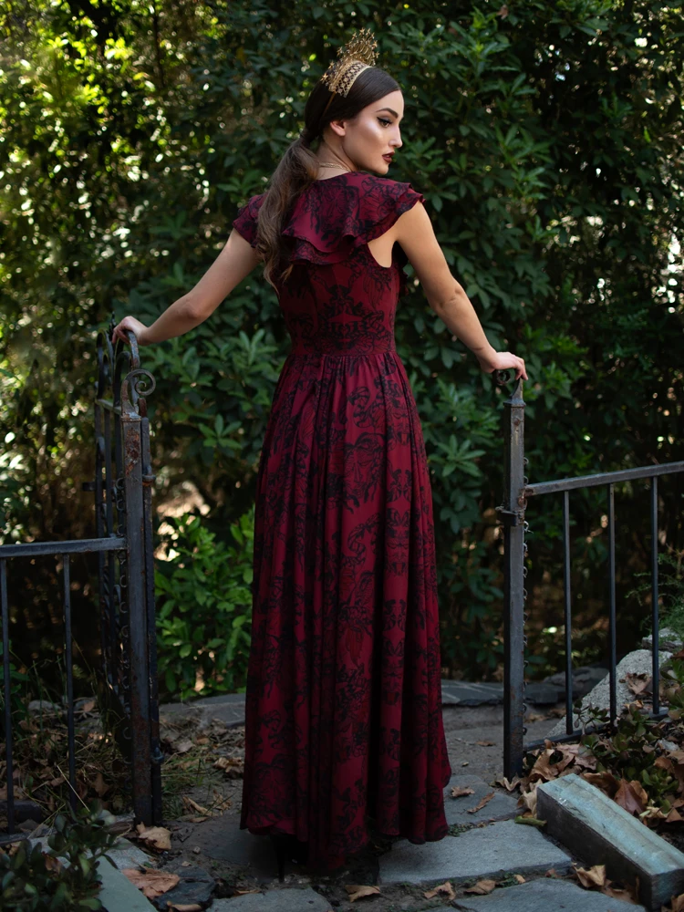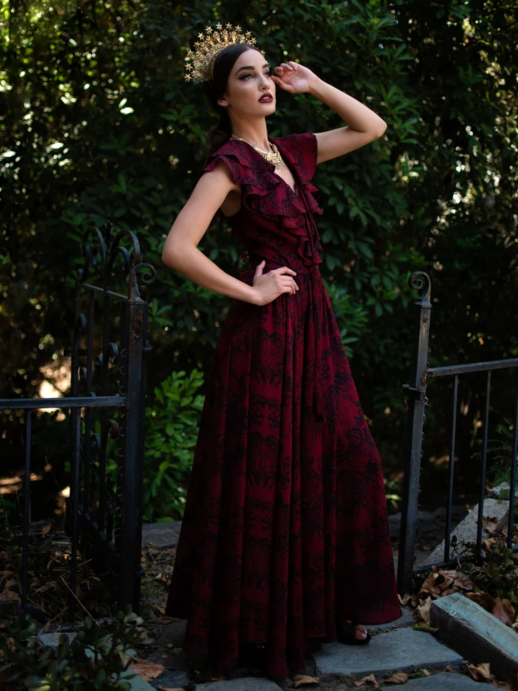 This vintage inspired gown takes inspiration from 1930’s Grecian beauties with 1970’s maxi dresses. Showcasing original artwork by famed artist Natalie Hall (Shape of Water) of the ill fated Gorgon from Greek mythology. Feel like the real goddess you deserve to be. It’s hard to describe how regal you will feel in this generously flowing full length gown with plunging front neck, held strategically in place by a lace up tasseled self tie. Double tiered ruffles border the neckline for an ethereal look. Featuring a sleeveless and fully lined bodice and side pockets for versatility. Finished with a center back YKK® invisible zipper.