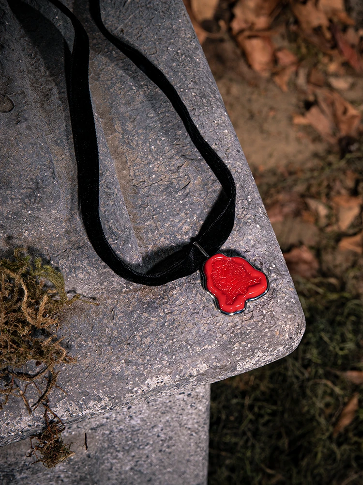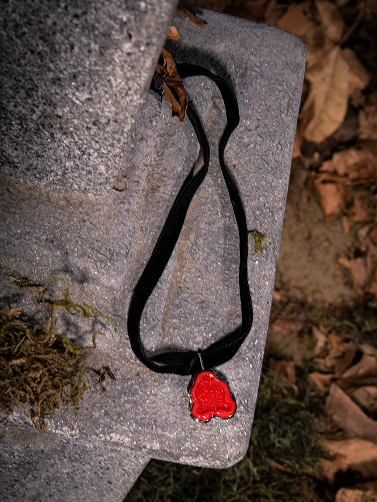 We love the iconic Van Garrett Wax Seal so much, we made it into a necklace. Silver-plated, red resin with an 18″ double face velvet 10 mm (3/8″) ribbon with back clasp. Comes with a gift box. Import.