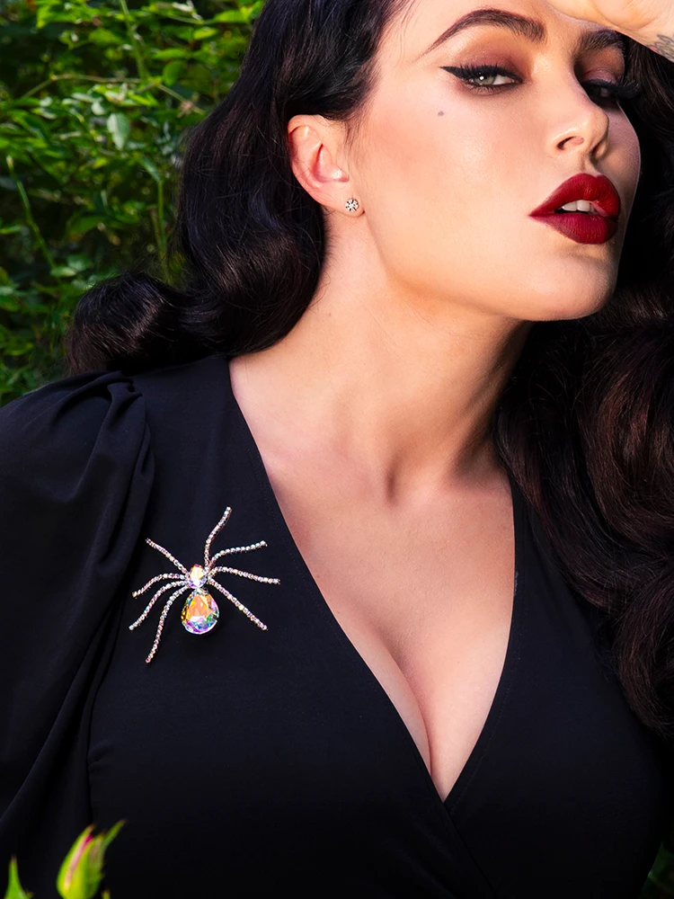 This petite version of the Black Widow spider brooch is the perfect companion to the large version or worn alone. This decadent rainbow Aurora Borealis stone with silver plated brooch is based on an iconic vintage large rhinestone spider brooch. The replica features a beautiful silver plated finish with a solid brooch pin back. Each rhinestone is made from a high quality glass that is prong set featuring a small and large teardrop against tiny prong set stones on the 8 legs. The stones are delicately inlayed by hand by artisans.