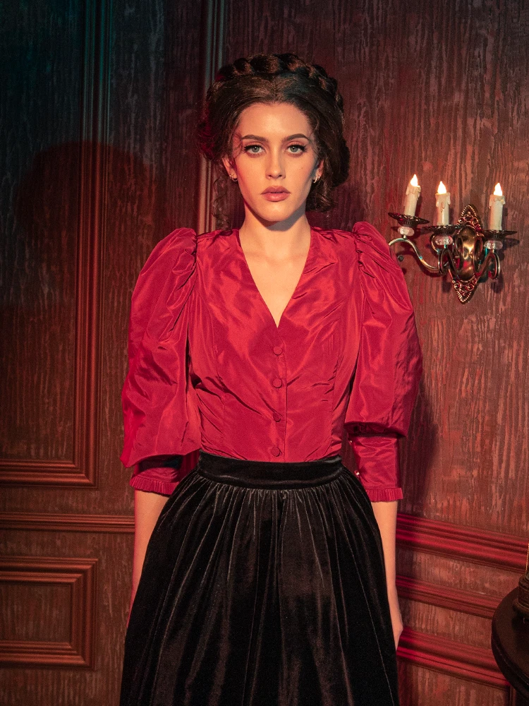 We drew inspiration from one of our vintage discoveries to create this romantic taffeta Edwardian blouse. The material has a subtle iridescence, reflecting light and adding a touch of luxury. The statement gigot sleeves feature a sharp self-pleated trim at the buttoned-up cuff, perfect for pushing up and pairing with tailored jeans for a modern twist. Alternatively, pair with our bustle skirt for a historic look. The blouse also includes a V neckline and self-covered button up front, with a flounced peplum hem at the seamed waist.