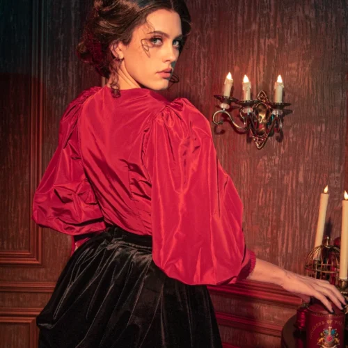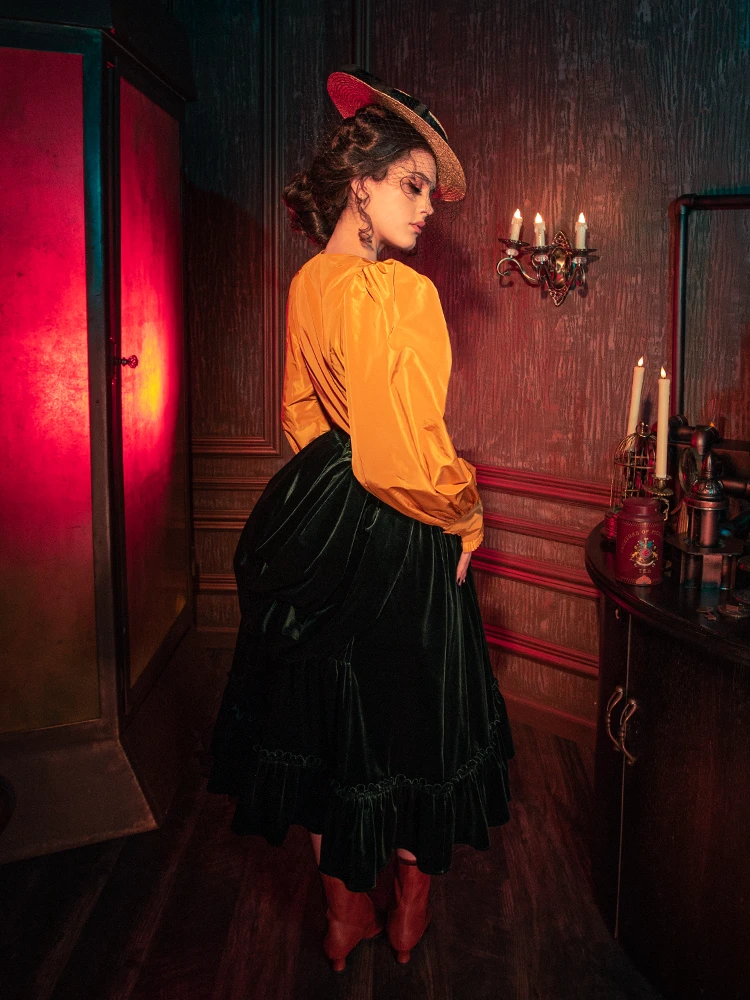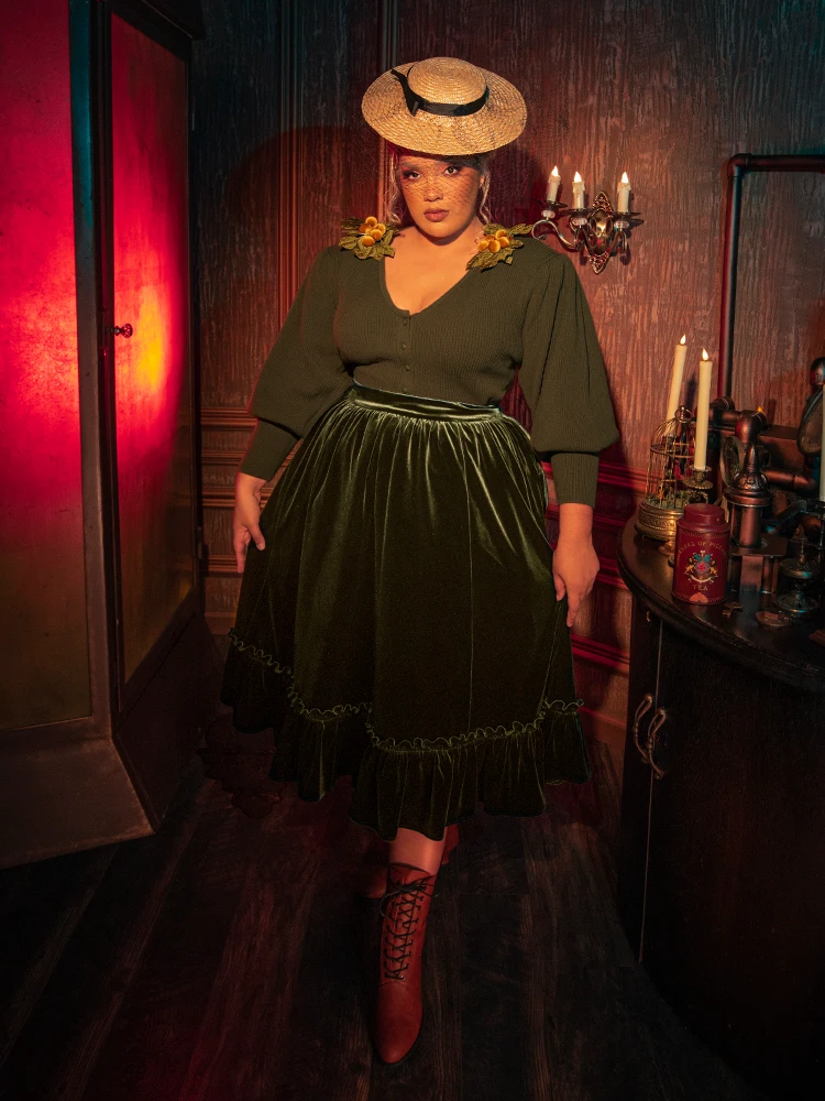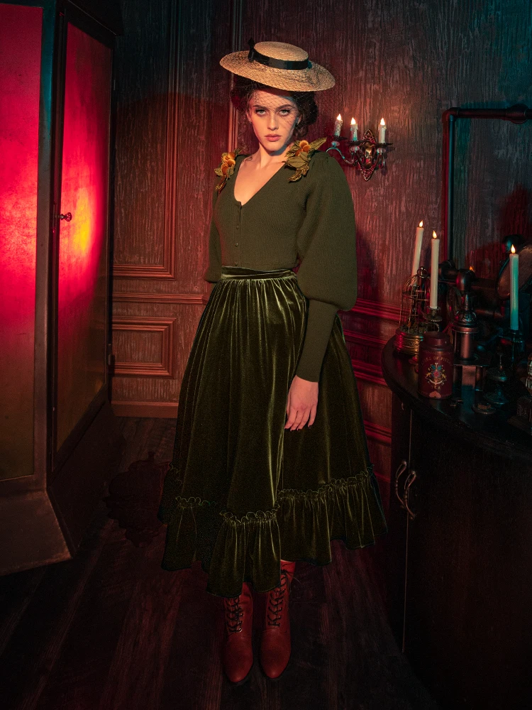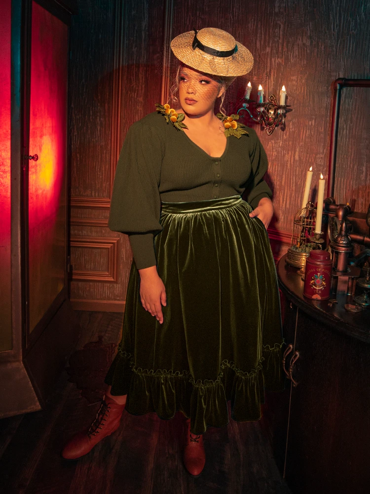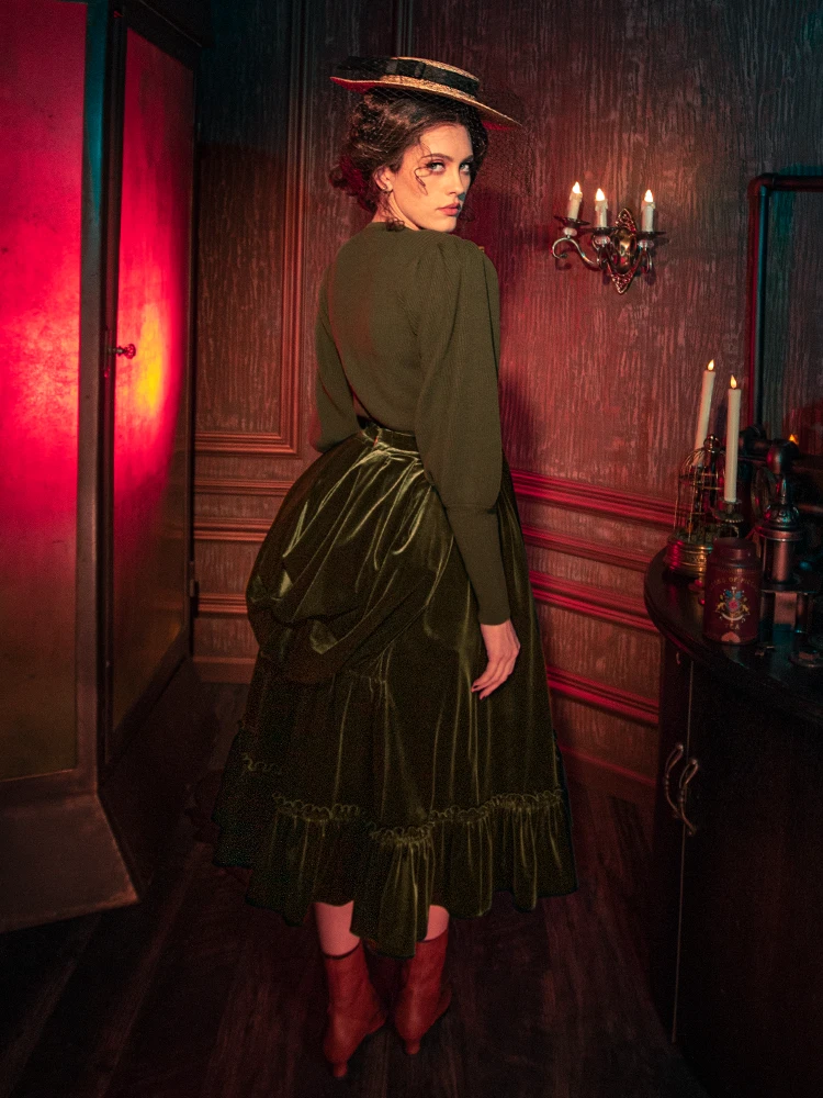 Indulge in luxury with our Victorian Velvet Bustle Skirt in Olive stretch velvet. This opulent skirt boasts a thick velvet material, deep side pockets, and a crinoline under-skirt. The elegant design is highlighted by a ruffled flounce hem and a softly pleated back bustle. Embrace sophistication and fullness with this striking piece.