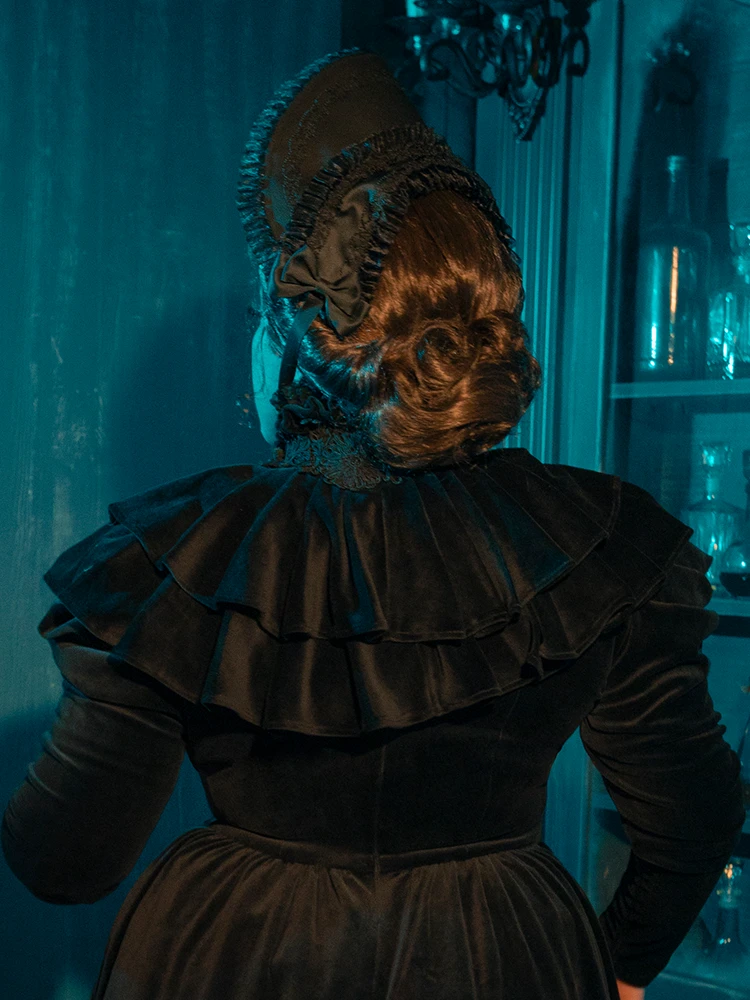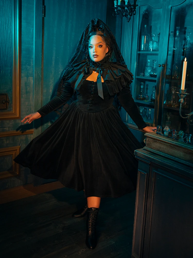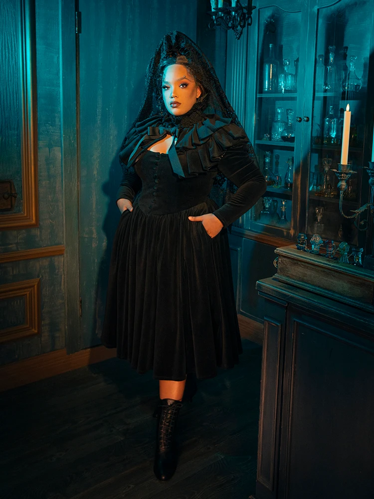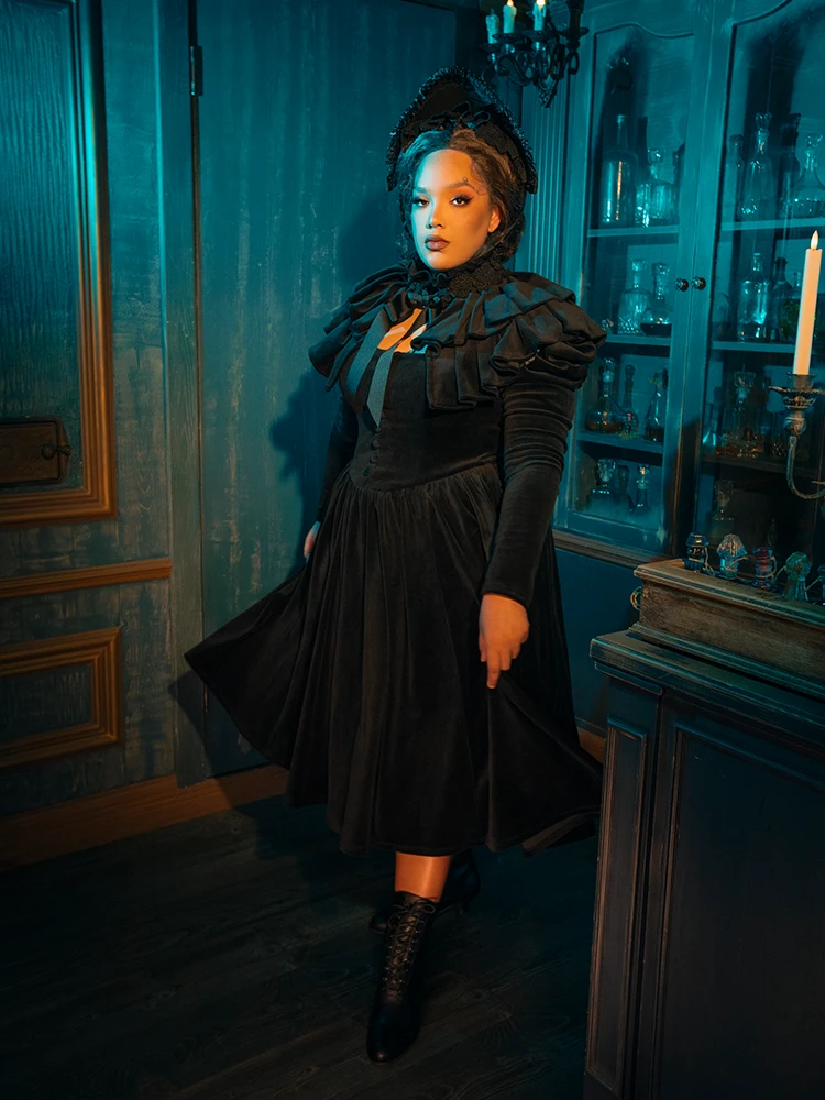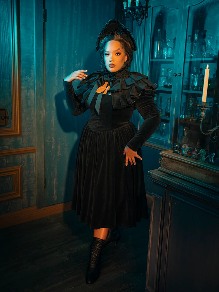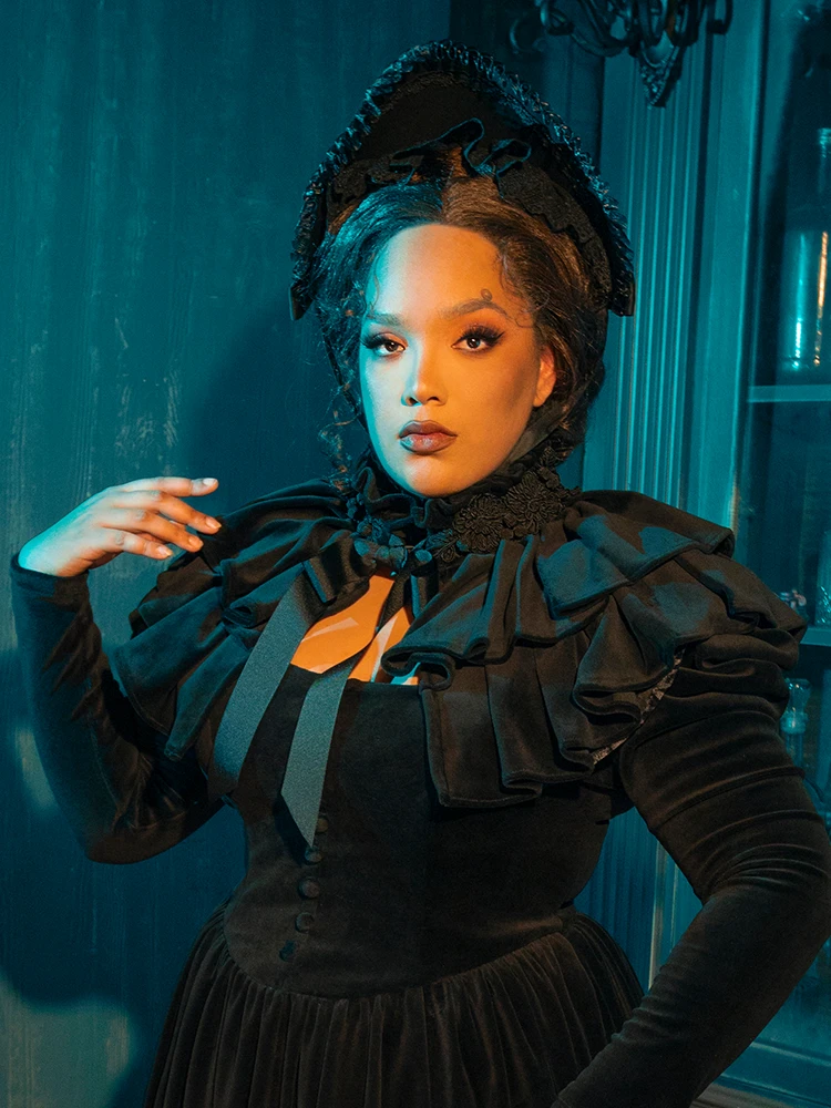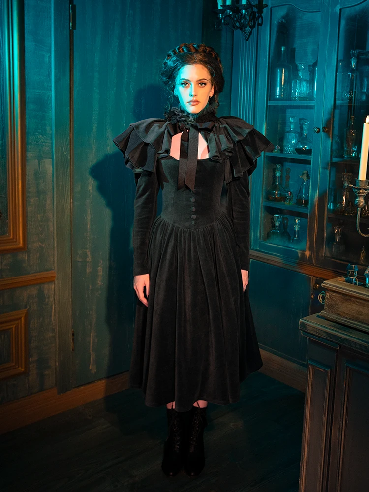 Indulge in opulence with our Victorian-inspired dress design, complete with a luxurious removable capelet. This exquisite velour ensemble boasts a dramatic yet comfortable fit, accentuated by a matching ruffled capelet. The deep portrait neckline features self-covered buttons, with the upper three buttons functional. The bodice’s princess seams create a Victorian hourglass figure without sacrificing comfort and gives a touch of support with light boning at the sides. The full-shirred waist includes deep pockets for added functionality. The dress is finished with a concealed bridal zipper closure at the center back. Admire the statement-making leg o’ mutton deep pleated sleeves.