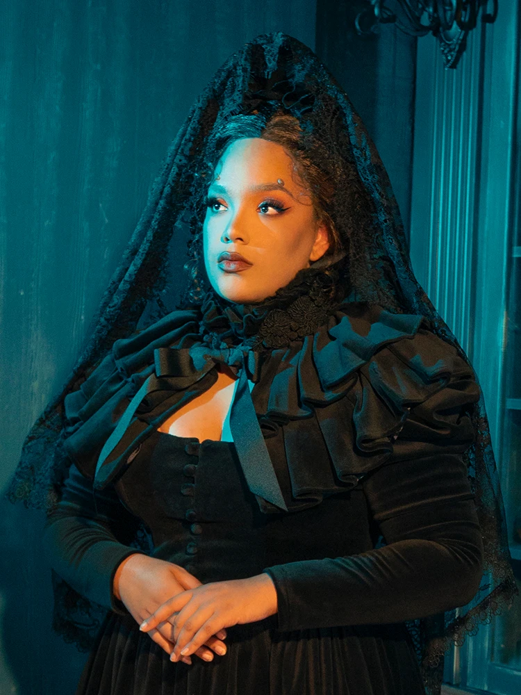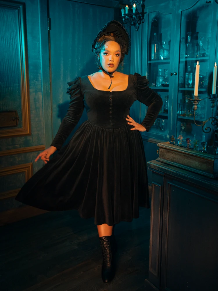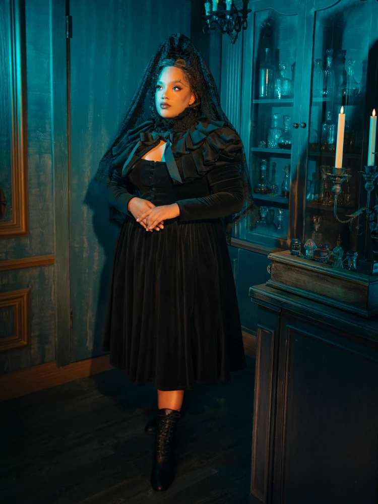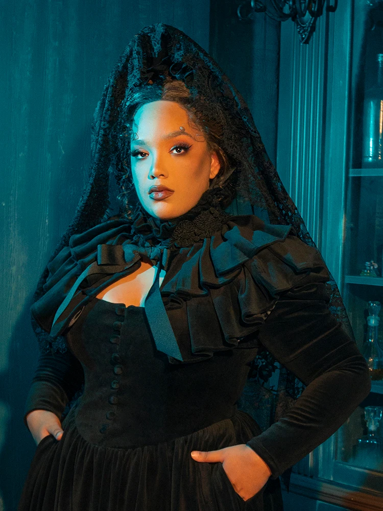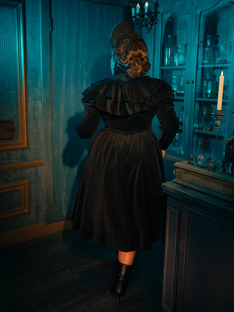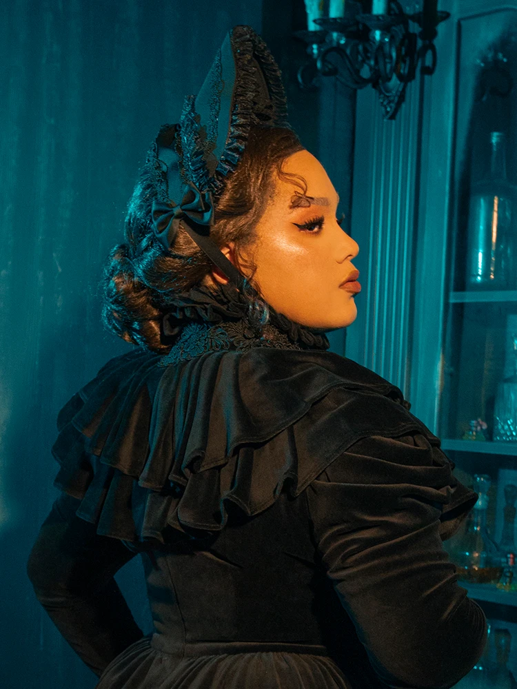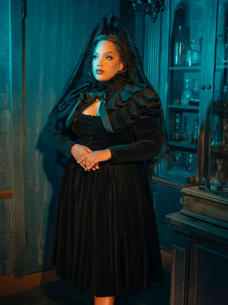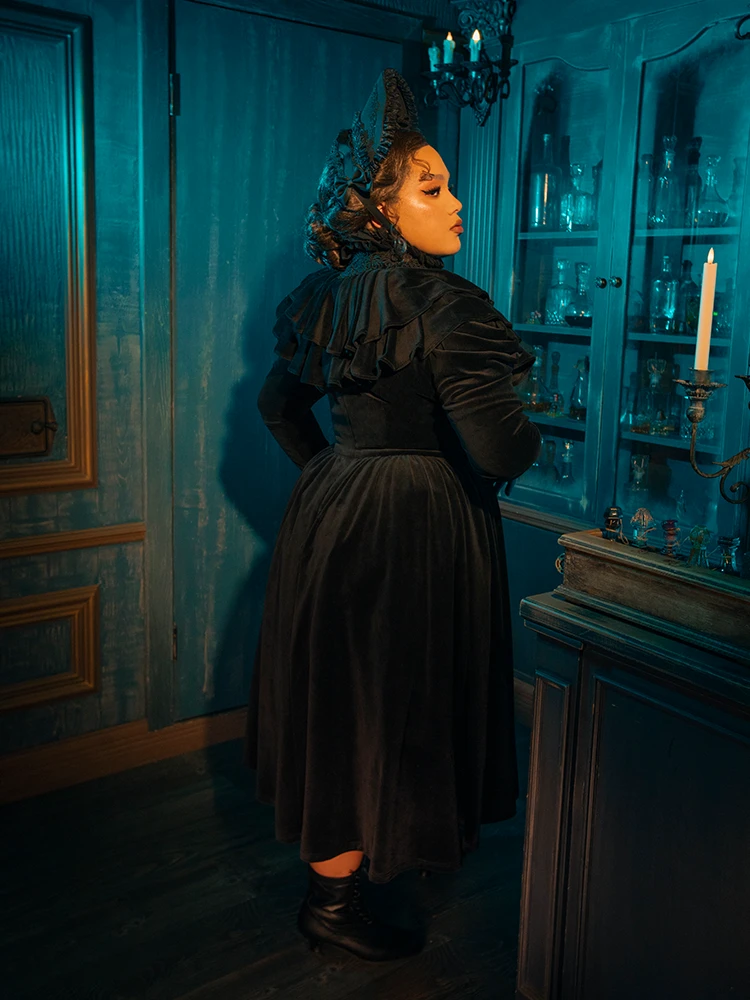 Indulge in opulence with our Victorian-inspired dress design, complete with a luxurious removable capelet. This exquisite velour ensemble boasts a dramatic yet comfortable fit, accentuated by a matching ruffled capelet. The deep portrait neckline features self-covered buttons, with the upper three buttons functional. The bodice’s princess seams create a Victorian hourglass figure without sacrificing comfort and gives a touch of support with light boning at the sides. The full-shirred waist includes deep pockets for added functionality. The dress is finished with a concealed bridal zipper closure at the center back. Admire the statement-making leg o’ mutton deep pleated sleeves.