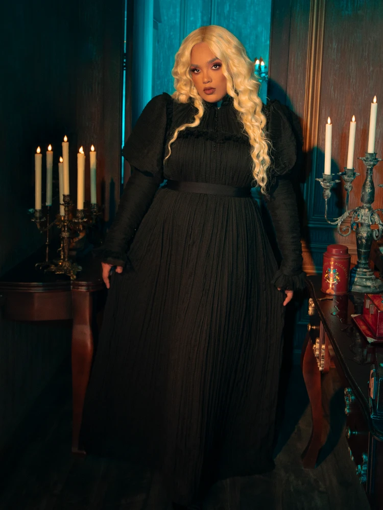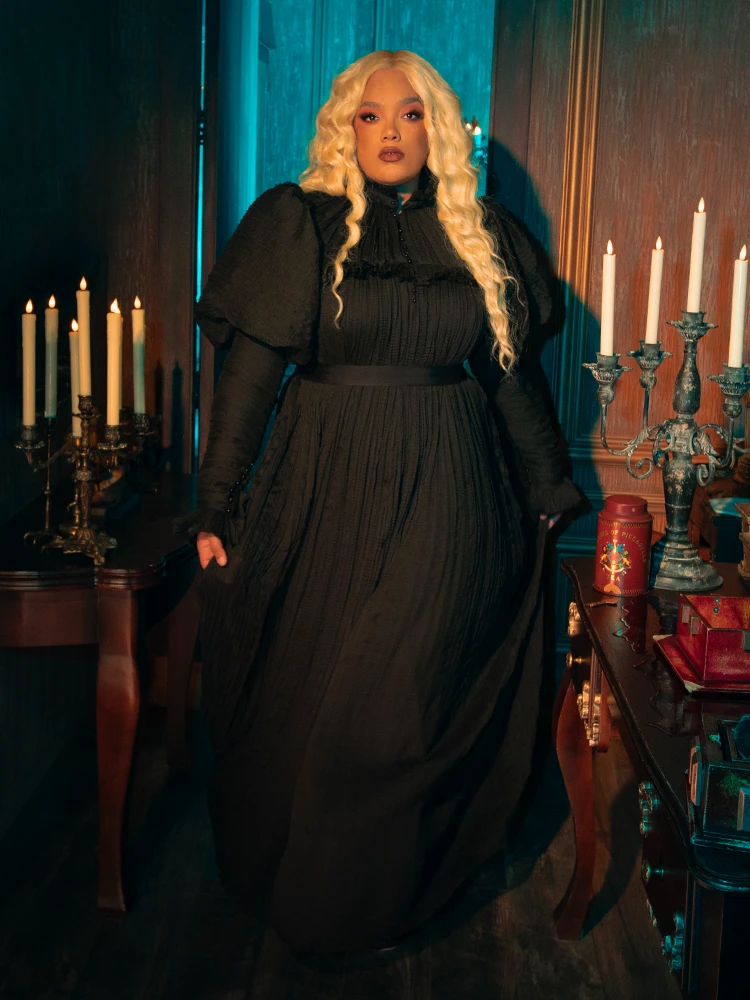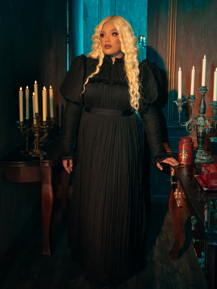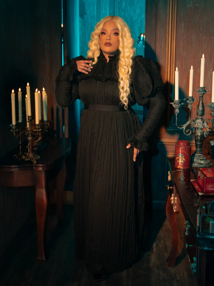 Sumptuously crafted from custom crinkled chiffon, this opulent column gown exudes effortless glamour. The deep, midnight hue of black adds a touch of refinement to its elegant silhouette. Every inch of the chiffon is expertly gathered, creating a delicate and ethereal texture. The collar, sleeve cuffs, and yoke are adorned with double-layered ruffles for a lavish touch. Raw edges add to the natural, organic look of the gown, which is fully lined with a butter-soft knit lining. The dramatic gigot sleeves are adorned with tulle for added volume, while decadent ruching cinches in at the lower part. Faux black pearls embellish the inner sleeves, while the cuffs are trimmed with a delicate ruffled cotton cluny lace. Complete with hook and eye closures and a front placket adorned with faux black pearls, this hauntingly beautiful gown is sure to captivate.