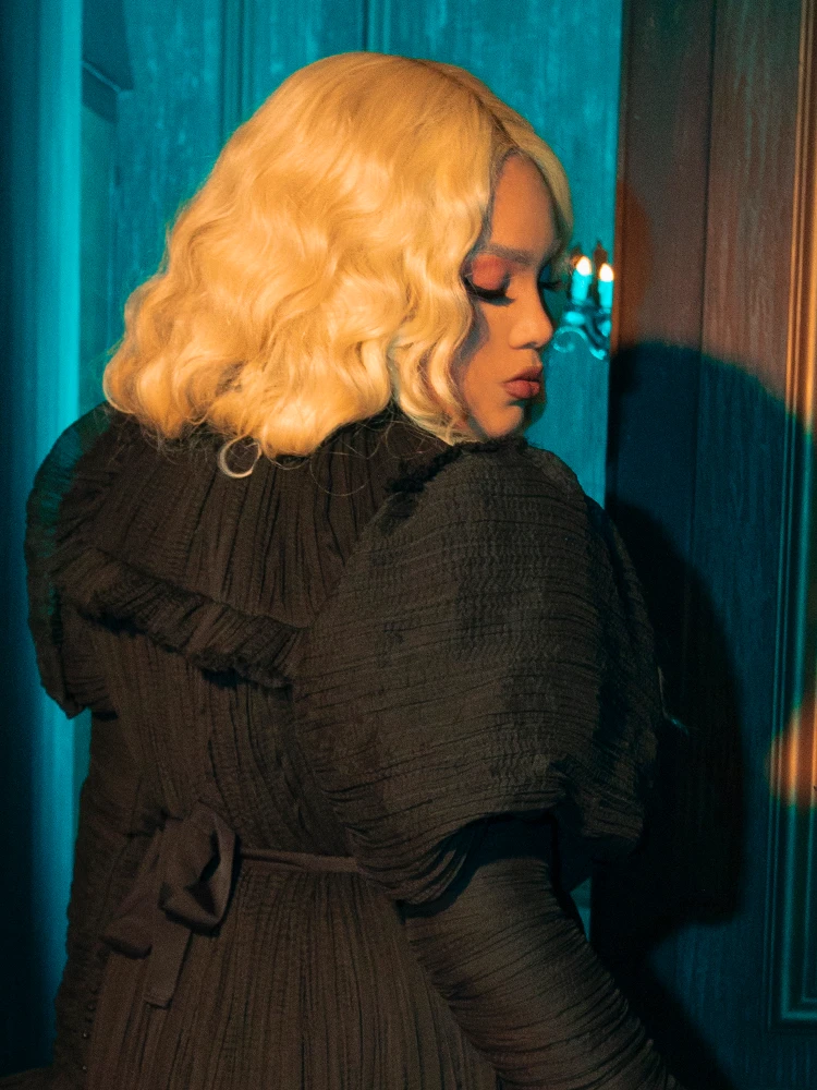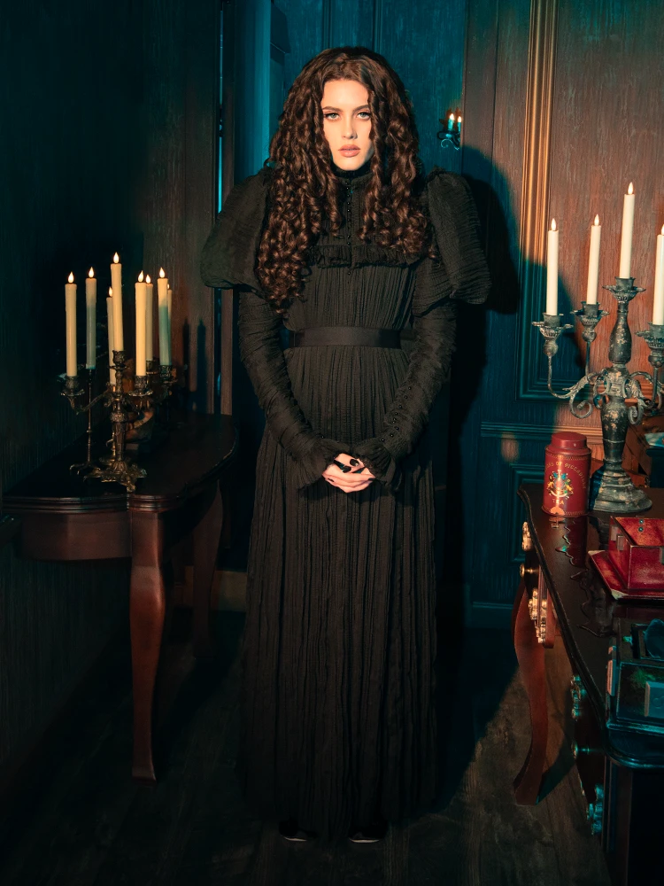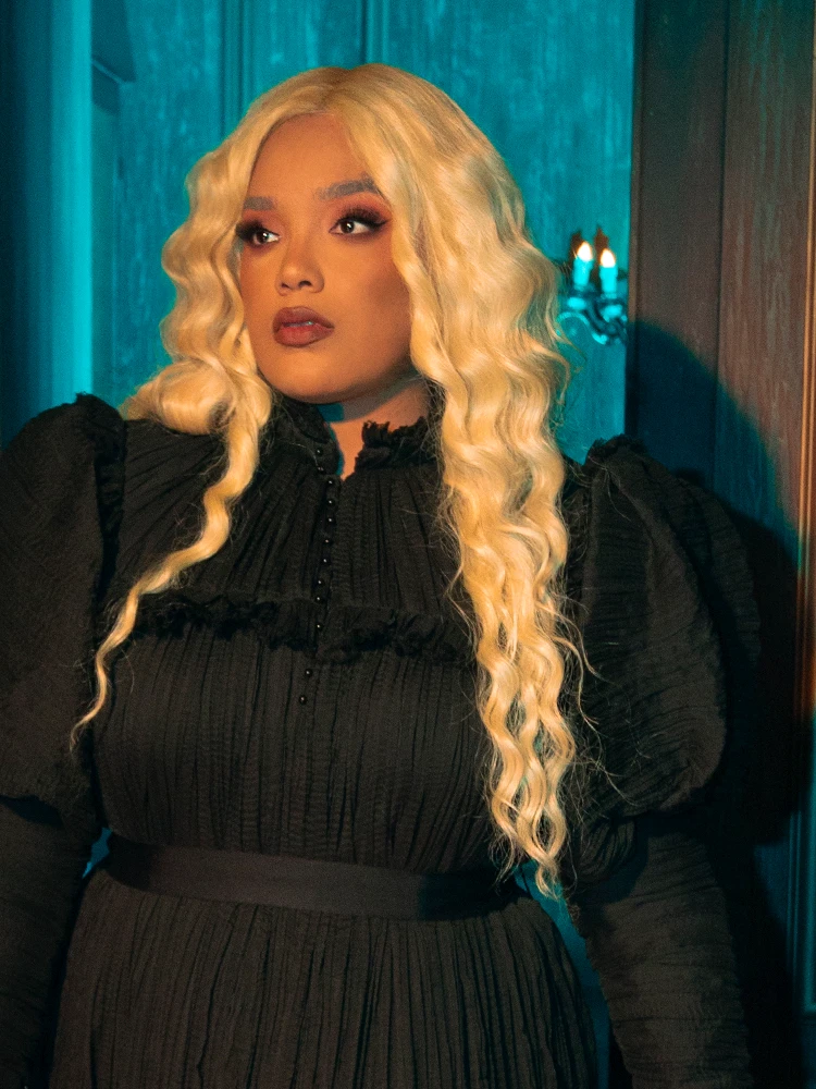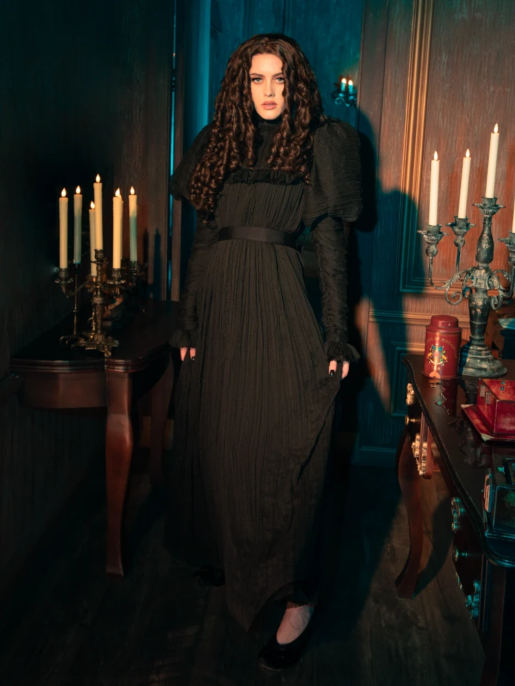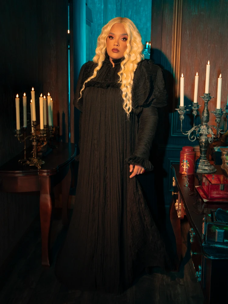 Sumptuously crafted from custom crinkled chiffon, this opulent column gown exudes effortless glamour. The deep, midnight hue of black adds a touch of refinement to its elegant silhouette. Every inch of the chiffon is expertly gathered, creating a delicate and ethereal texture. The collar, sleeve cuffs, and yoke are adorned with double-layered ruffles for a lavish touch. Raw edges add to the natural, organic look of the gown, which is fully lined with a butter-soft knit lining. The dramatic gigot sleeves are adorned with tulle for added volume, while decadent ruching cinches in at the lower part. Faux black pearls embellish the inner sleeves, while the cuffs are trimmed with a delicate ruffled cotton cluny lace. Complete with hook and eye closures and a front placket adorned with faux black pearls, this hauntingly beautiful gown is sure to captivate.
