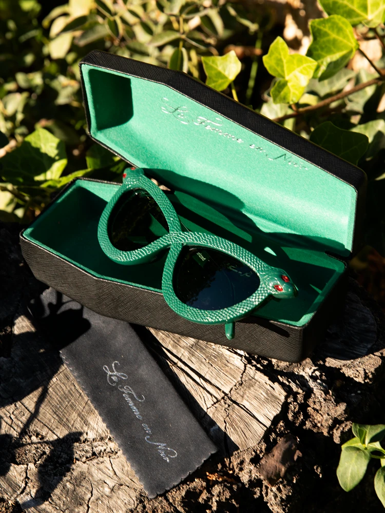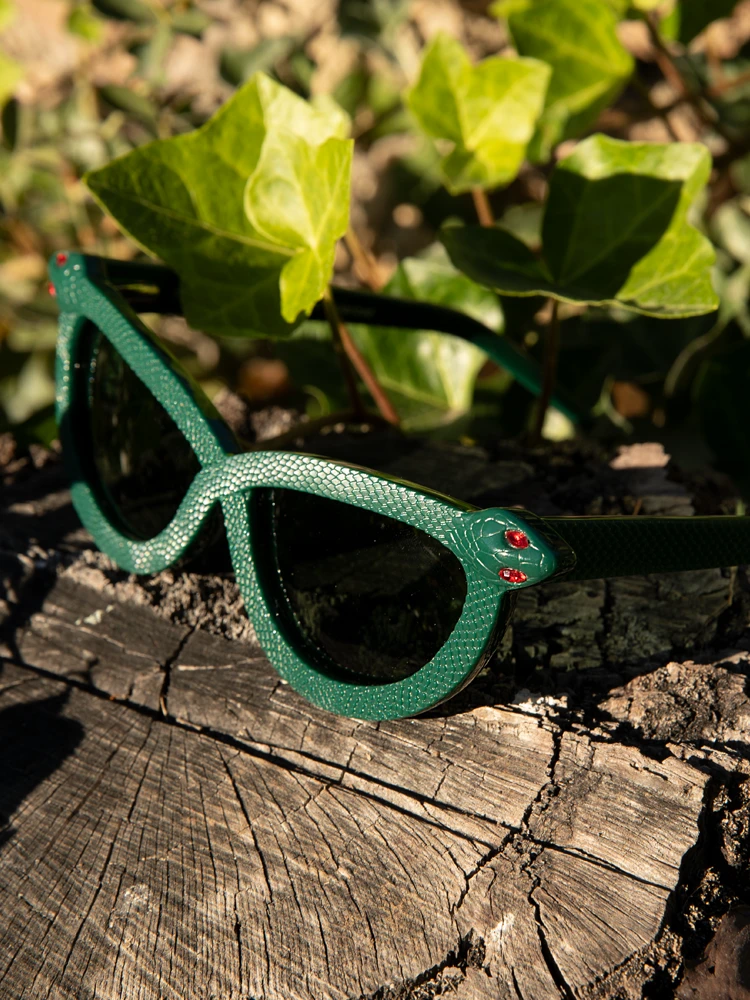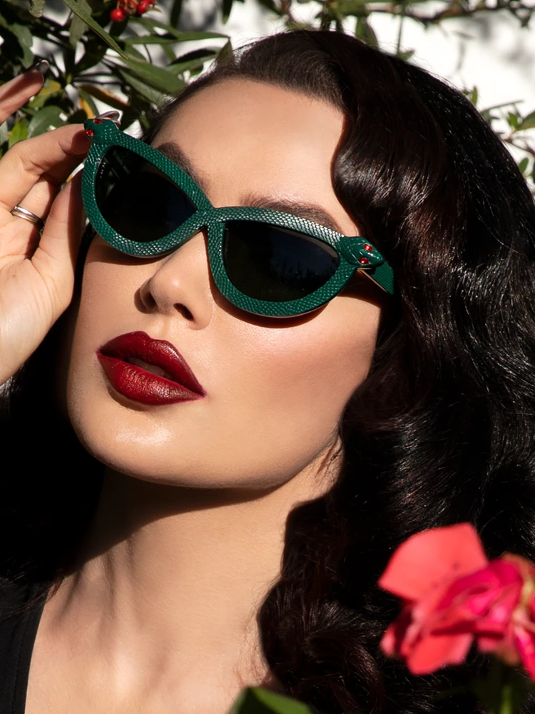 Serpents represent rebirth, guardianship, medicine, and have long been a mystical symbol across the world. Our exclusive designed sunglasses are inspired by the rare hand carved “Cabana Sunglasses” from the 50’s by Paulette Guinet. We’ve modernized it with polarized lenses and ophthalmic quality acetate frames that can hold your own prescription lenses up to 500 diopters. Ruby Swarovski ® crystals adorn the serpent eyes. These high quality frames come with our signature designed faux leather coffin case lined in green and cleaning cloth and our logo box.