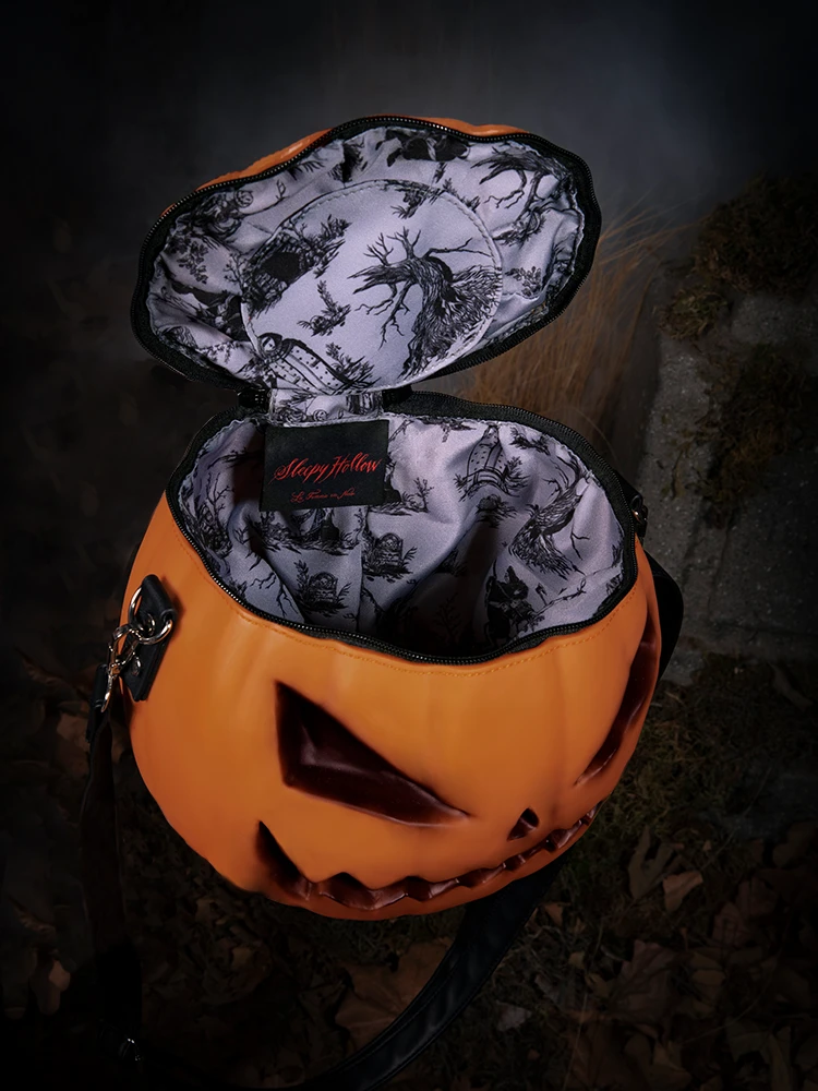 The baby pumpkin is the perfectly petite version of our popular regular-sized headless horseman’s pumpkin head. Recreated as a molded soft PVC vinyl and a full three-dimensional shape. Includes two straps to wear as a crossbody or with a handle strap. Orange body with black airbrushed eyes, nose, mouth, and brown stem. YKK® black coil zipper with silver pulls and lined with our Sleepy Hollow Toile print.
