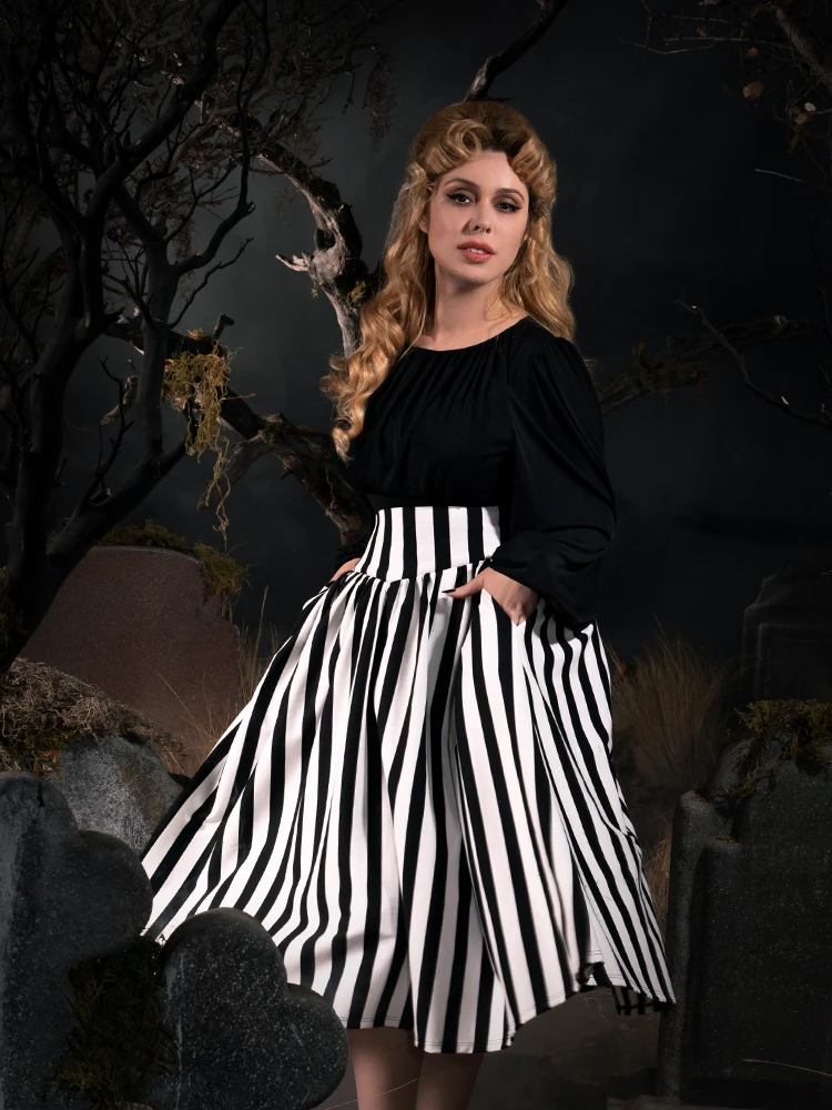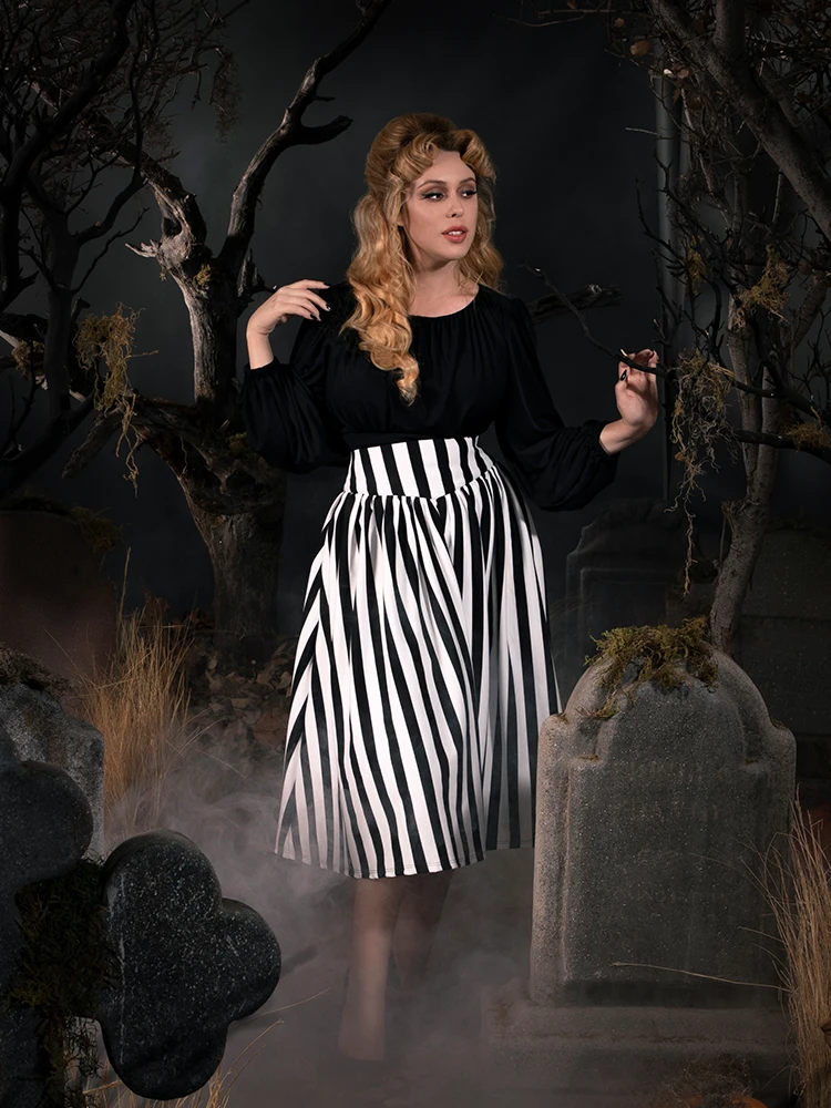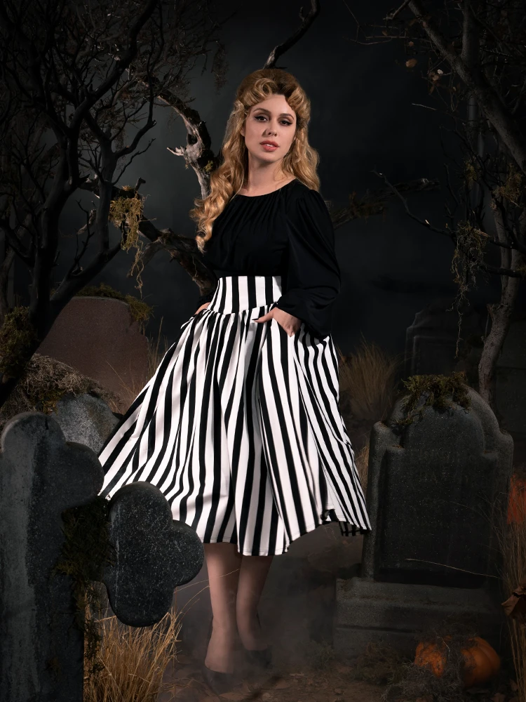 Made from striped ponte de roma knit jersey. It’s based on the iconic black and white striped outfit that Katrina Van Tassel dons whilst accompanying Ichabod Crane back to New York City. The front and the back features a dipped drop waist seam. It’s finished with deep pockets on the side and a center back zipper. The skirt falls slightly at calf. Material is a knit 76% cotton, 20% polyester, 4% spandex.