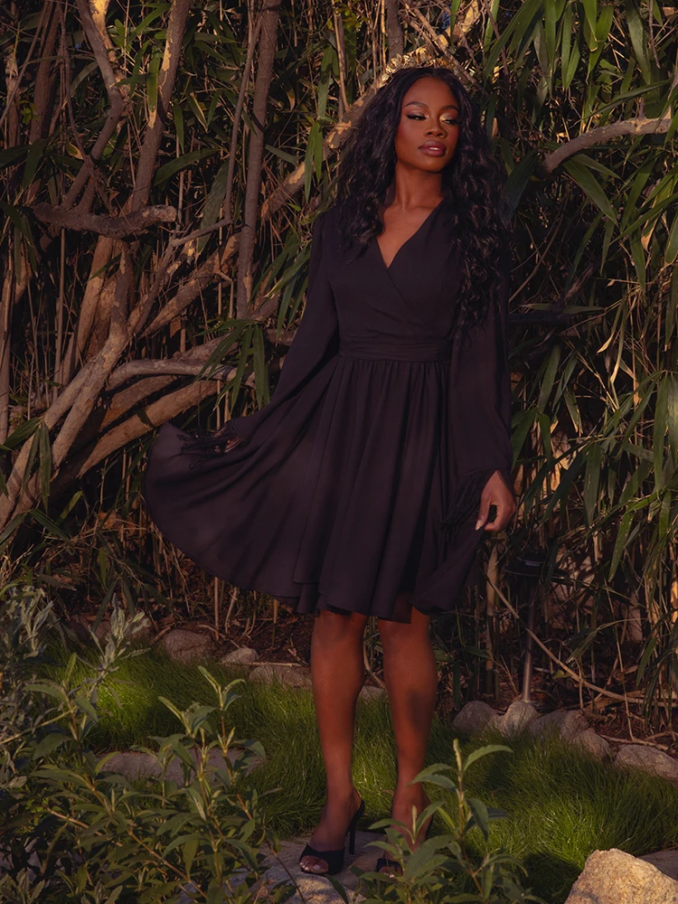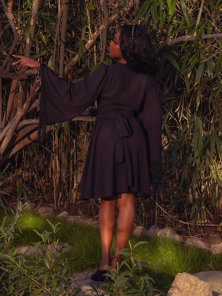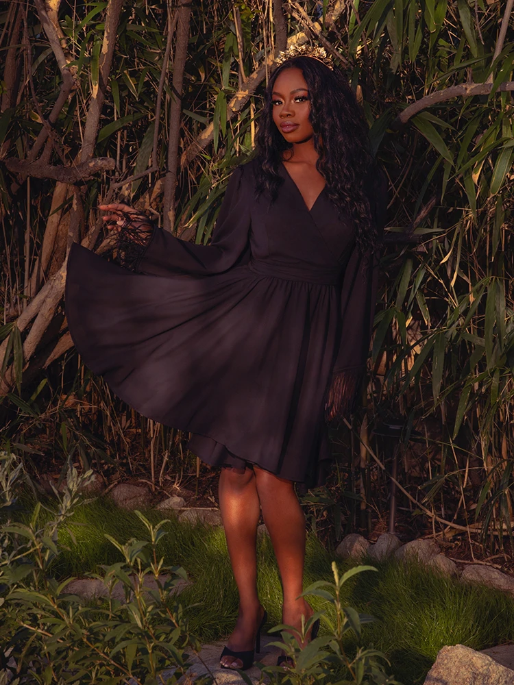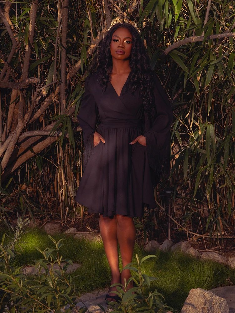 Transform into a modern-day goddess with our Styx Wrap Dress. This true wrap dress features a button closure and attached sash that cinches at the waist, creating a flattering full circle skirt silhouette. The knee-length skirt with pockets and elasticized back provides both style and comfort. The exquisite bell sleeves with 6″ black fringe detailing exude a vintage 70s vibe, while the V-neckline adds a touch of sophistication. The dark romantic pomegranate floral print evokes the allure of the underworld. Pair with knee-high boots for a luxurious and timeless look.