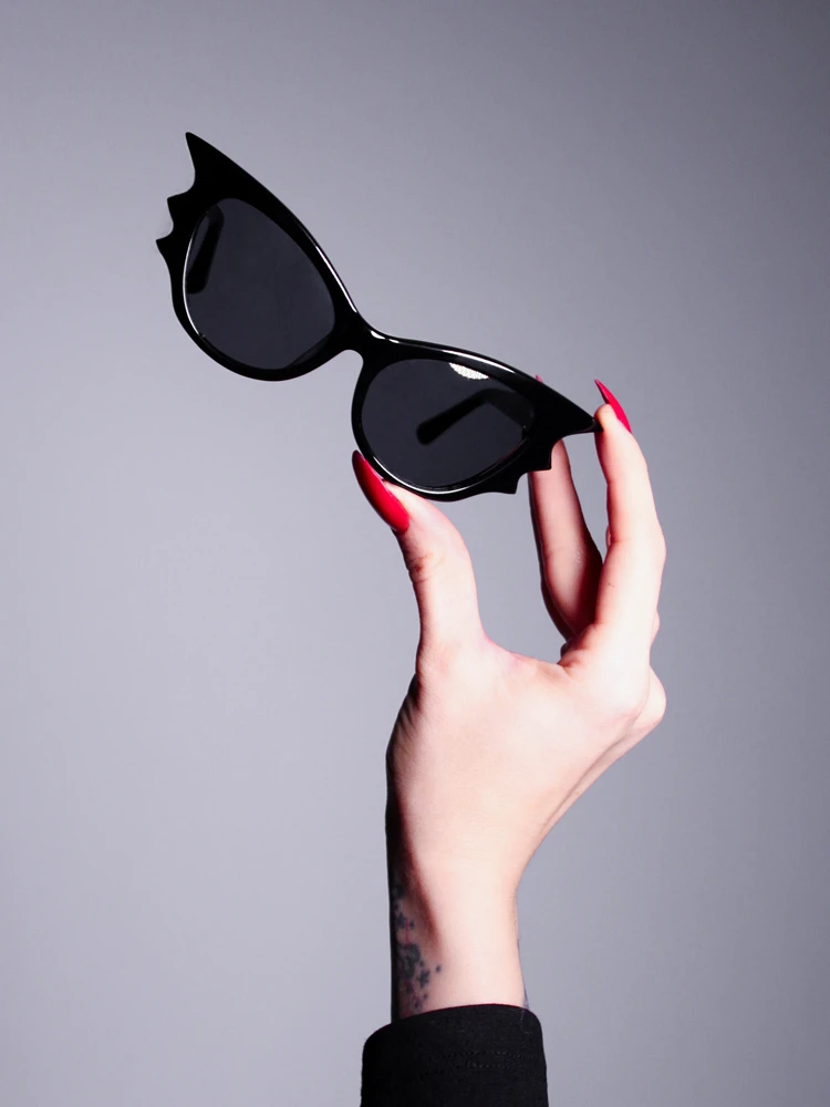 These unique batwing cat-eye frames are quite special! Instead of the single point, it has three that create a batwing effect. Inspired by vintage frames from Peggy Guggenheim’s infamous bat shaped frames with a dark twist.