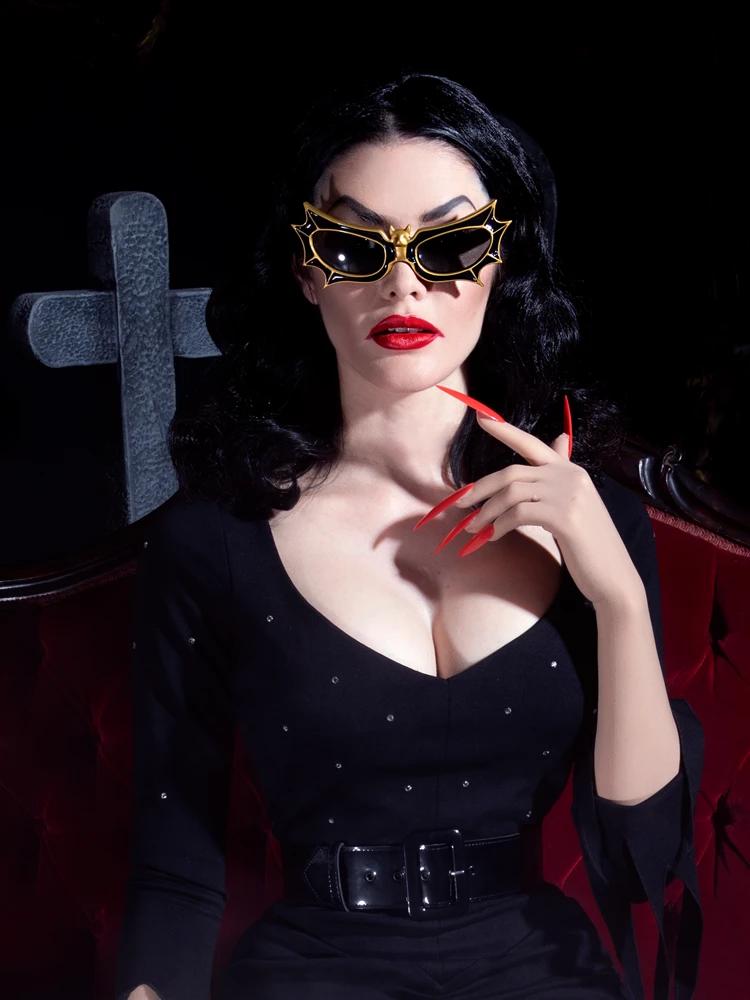 Inspired by the iconic glamour ghoul Vampira®’s famed glasses, La Femme en Noir has reimagined them for everyday wear. These incredibly articulate glasses are made from high quality imported Italian acetate with polarized lenses (to reduce glare) and spring hinges to allow for the most optimal fit. They’re finished with gold acetate with black painted inlays and black logo moon. These glasses come with a case and a microfiber cloth in our logo box.