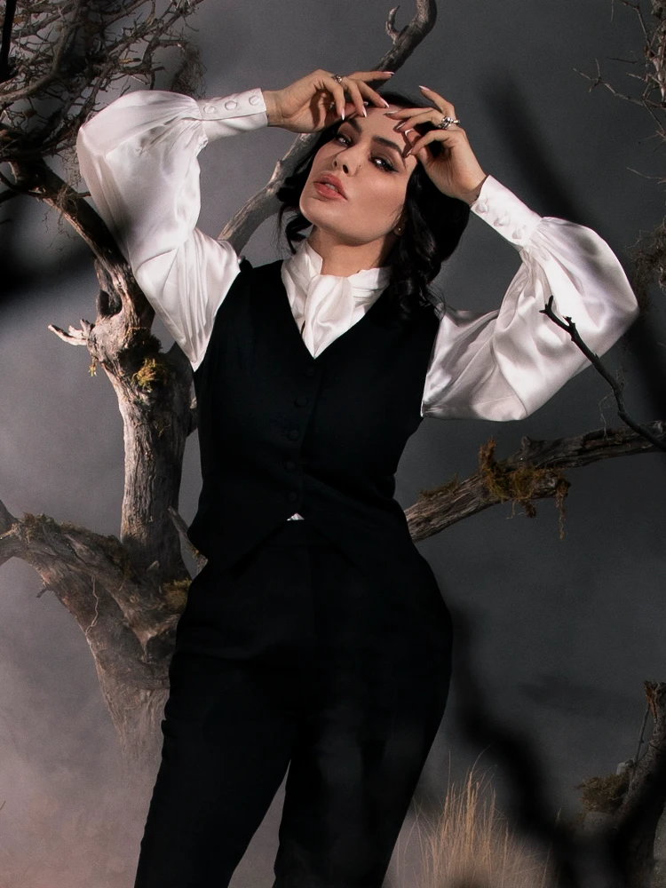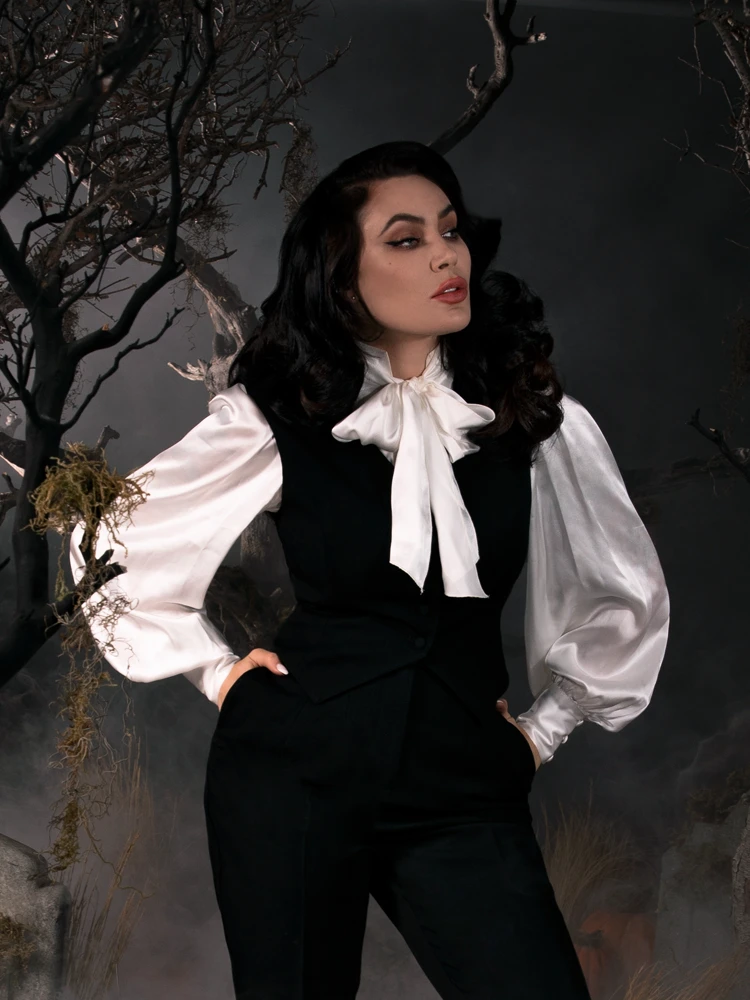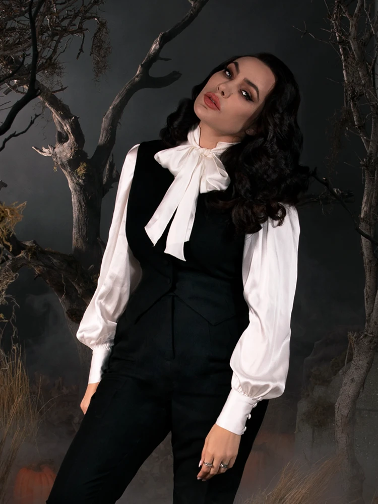 We think our new Victorian blouse will quickly become a staple in your wardrobe. Made from a luscious high-quality silk charmeuse, this blouse showcases a dramatic sleeve with longer cuffs and covered buttons. Plus, there’s extra shirring on the sleeve cap. The neck sash ties into a bow or wear it loosely like a cravat.