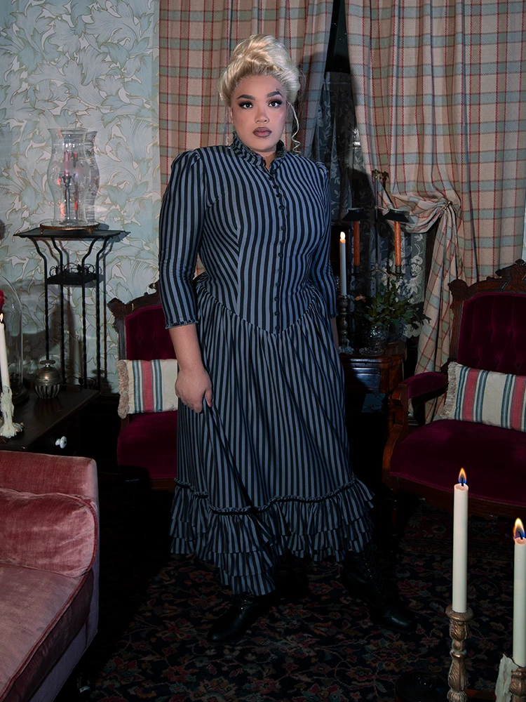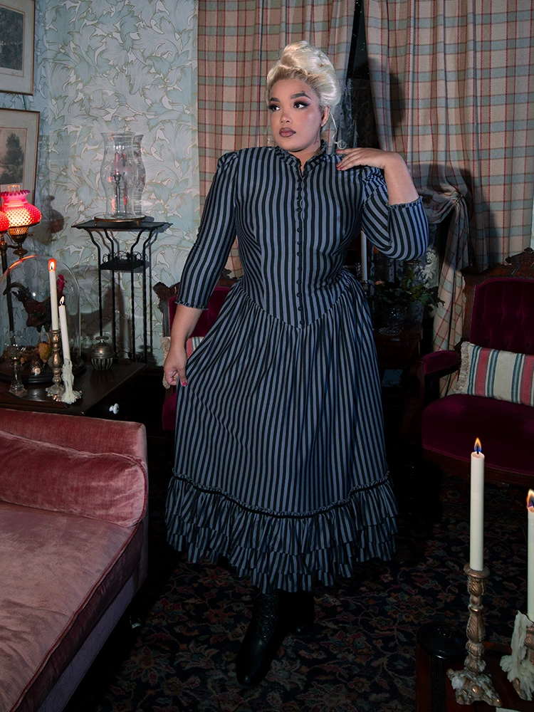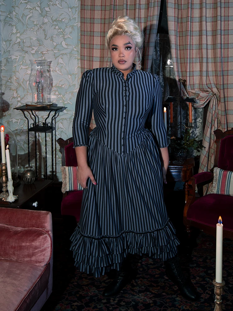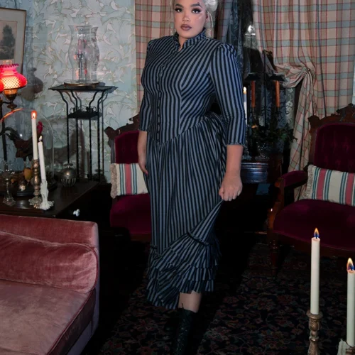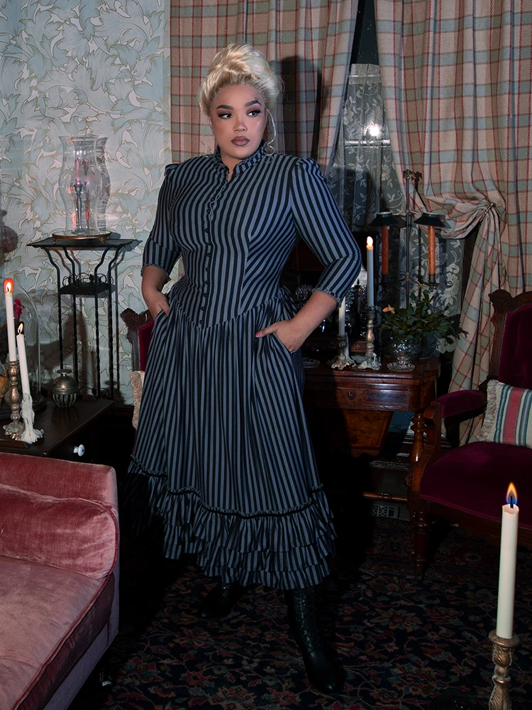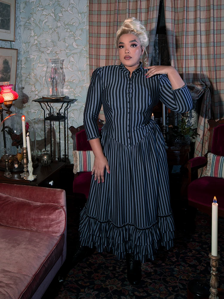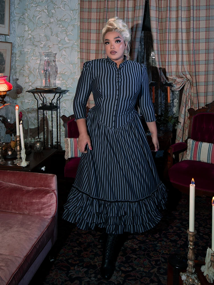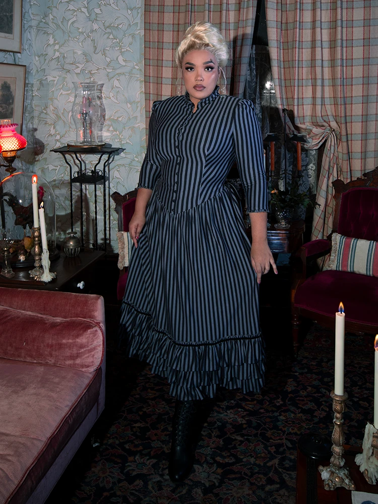 An elegant yet comfortable dress fit for a Victorian lady. Featuring a shirred drop waist with double-tiered velvet trimmed ruffles at the hem, a high ruffled collar with self covered baby buttons, and side pockets. The front opens above the bust. Center back invisible YKK® zipper.