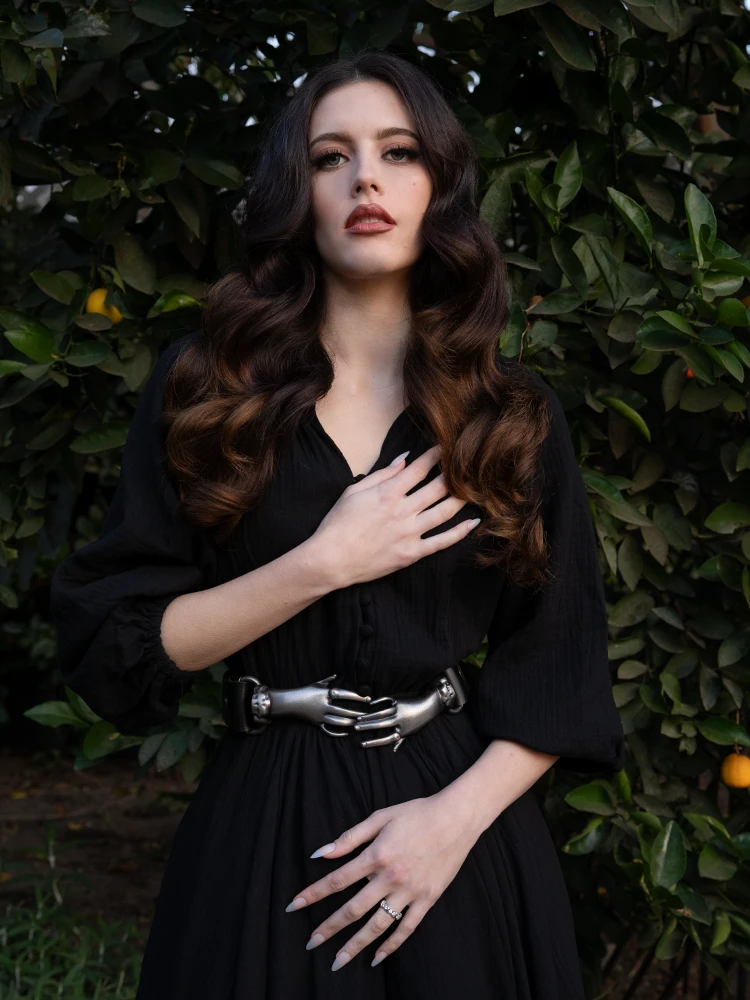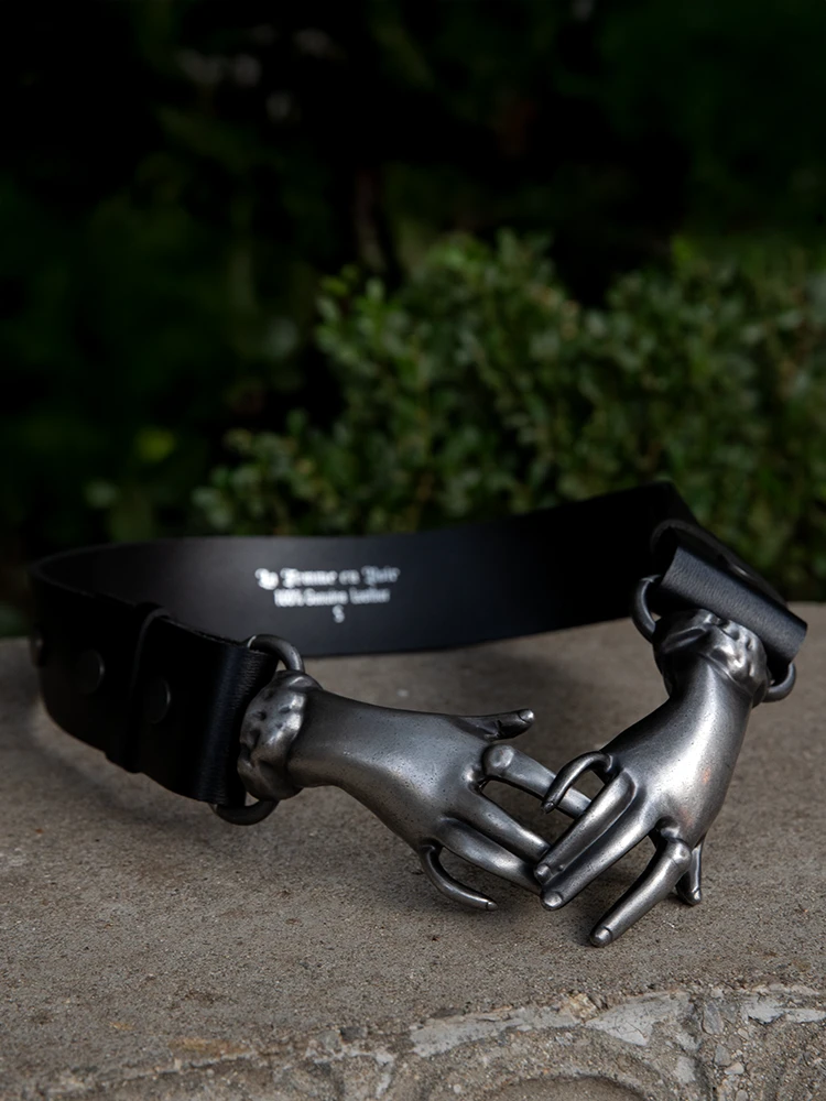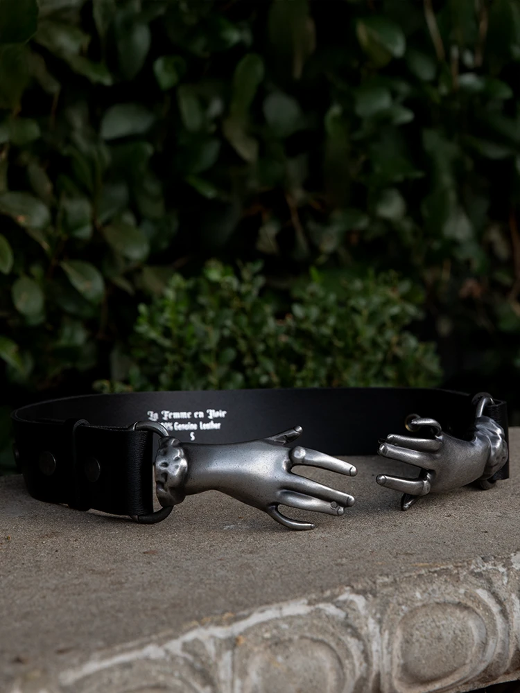 The Victorian Hands Belt exudes the timeless sophistication of a bygone era. The clasped hands was originally created in the Victorian era and later adopted by Elsa Schiaparelli in her 1934 Fall/Winter show as a nod to the surrealism art movement. This belt had a resurgence of popularity in the 70’s proving how timeless this belt truly is. Vintage versions are very sought after.