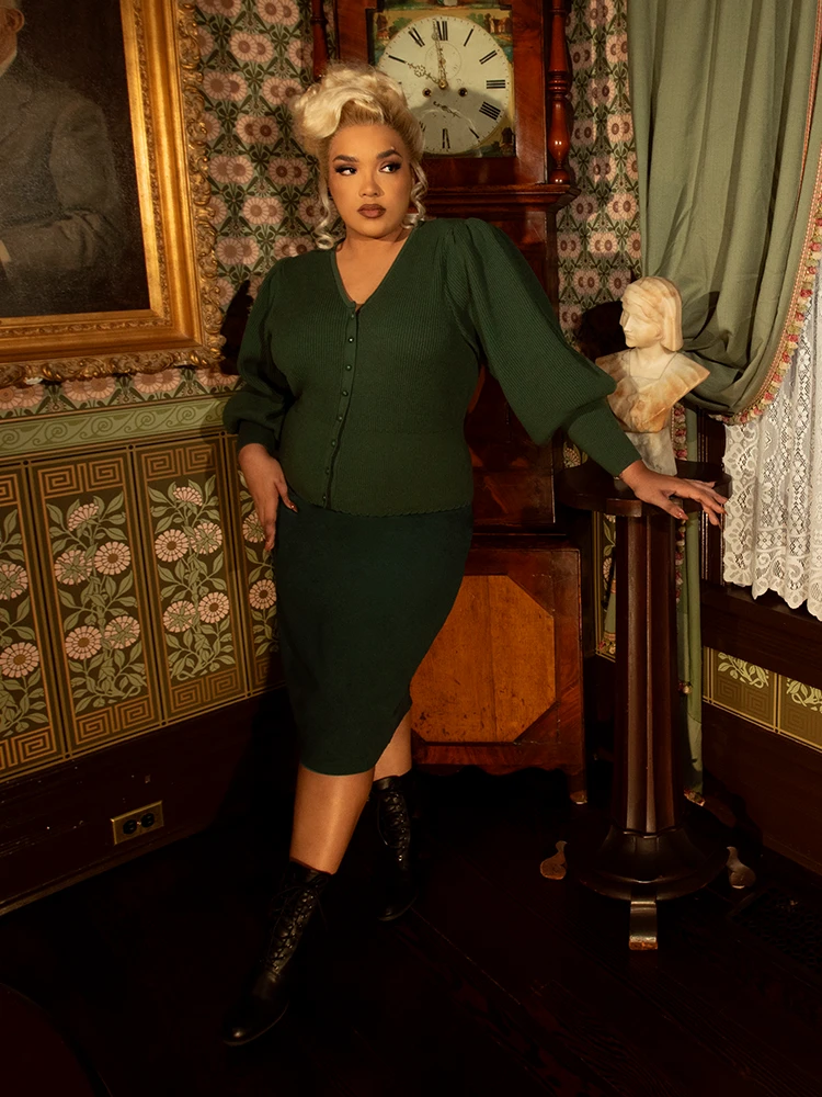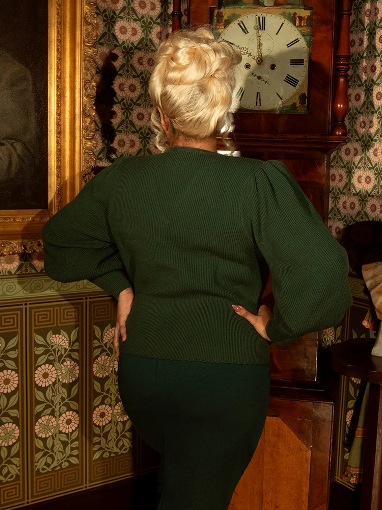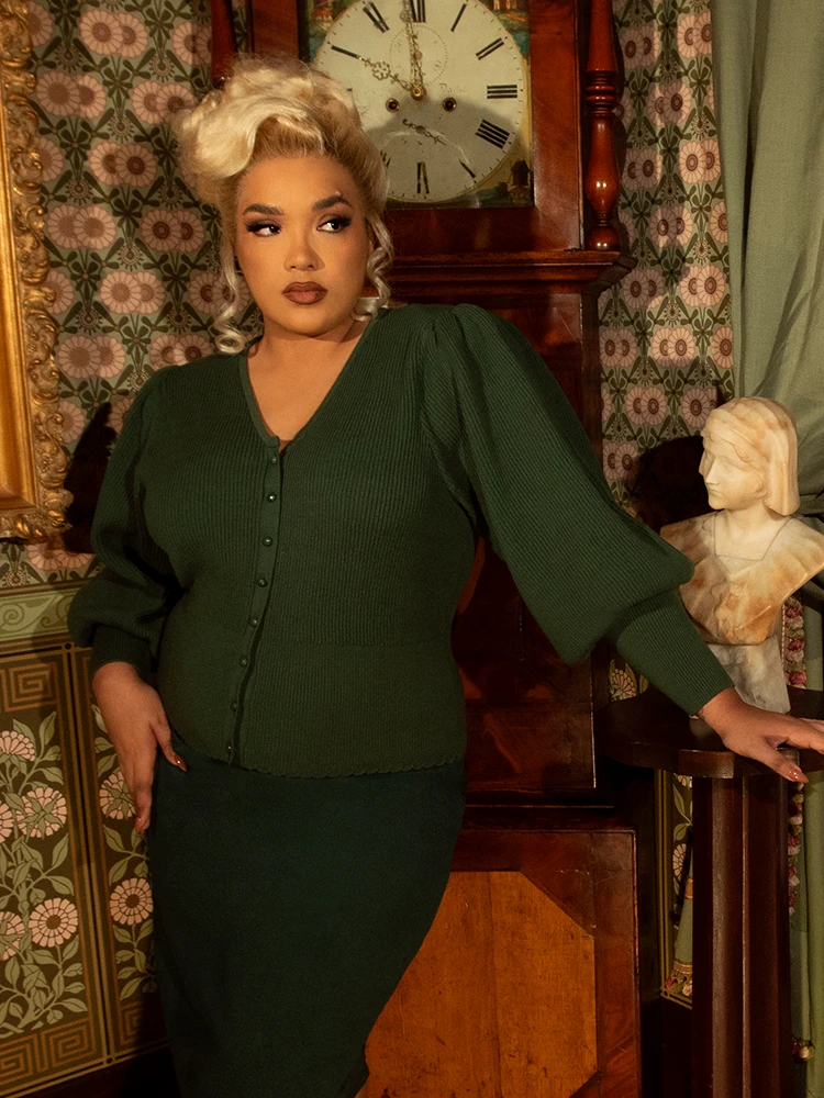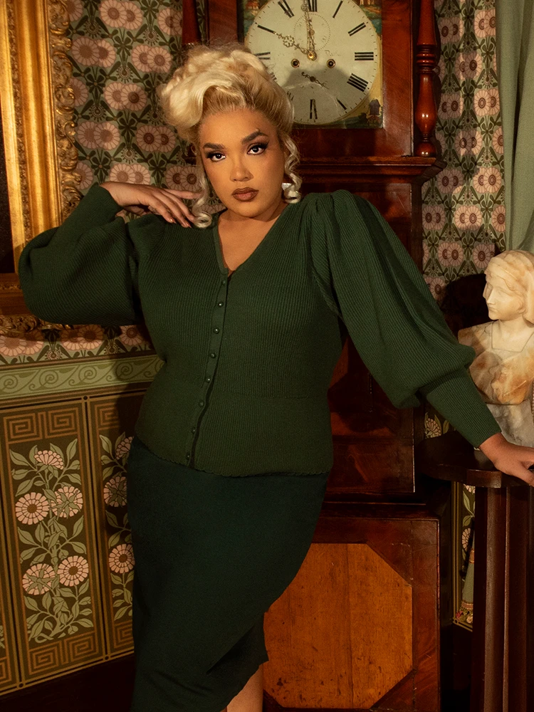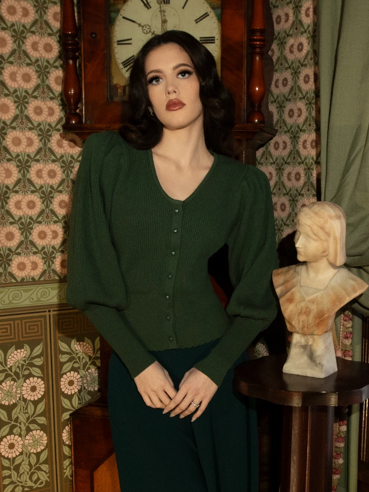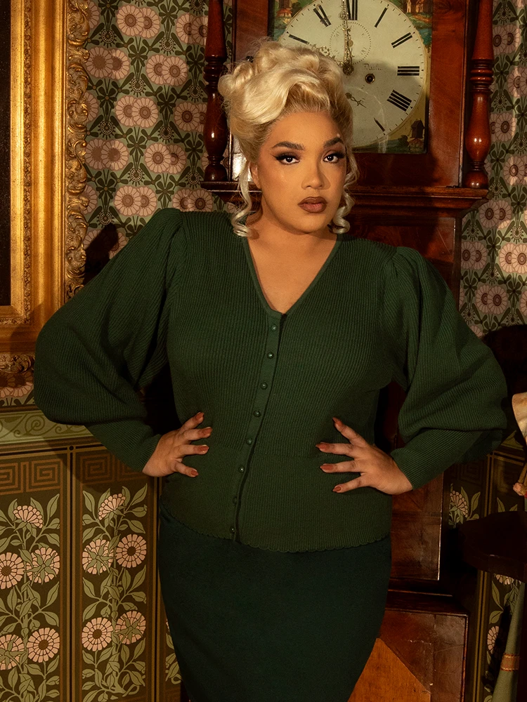 Elevate your style with the Victorian Mourning Knit Cardigan in hunter green. The soft v-neck is accented with faceted buttons on the front knit placket. The knit is a full-fashioned 7 gauge soft knit with a classic half cardigan stitch at bodice and sleeves and 1 x 1 rib at waist and sleeves. The detailed knit pattern, with a fitted body and exaggerated leg of mutton sleeves, is completed with a ribbed hem for a flattering hourglass silhouette. For more drama we’ve added shoulder pads that are removable. Same great sweater and design as previous just without the appliqué to make this item more accessible.Â